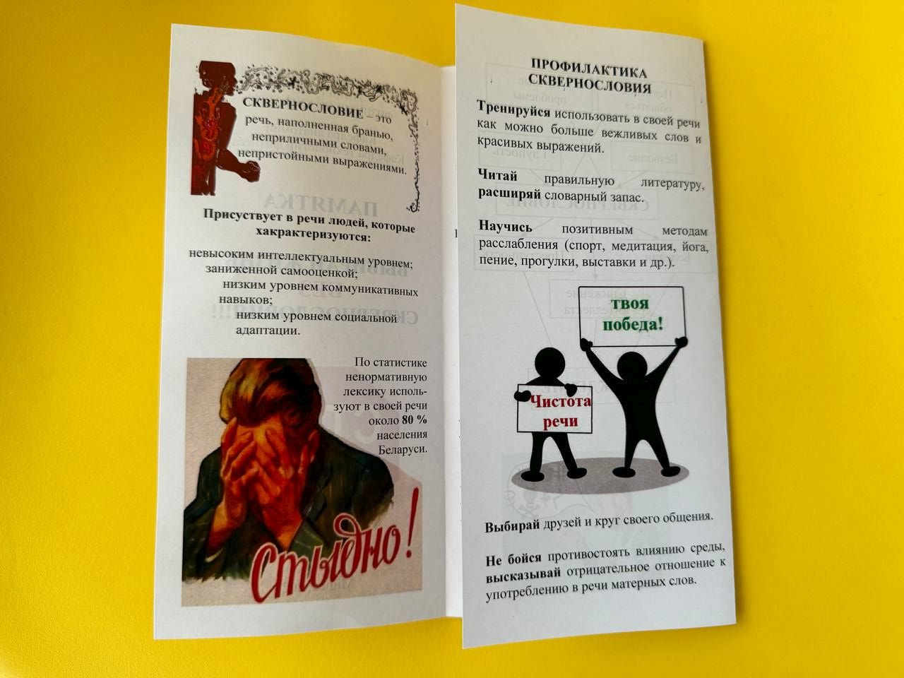 Проектной командой были подготовлены памятки для участников мероприятия, в которых кратко и по существу представлена полезная информация по последствиям и профилактике сквернословия. Студенты целевой группы проекта распространят памятки среди студентов университета, что позволит приобщить большее их количество к решению проблемы сквернословия и поможет искоренить нецензурную лексику в стенах университета.