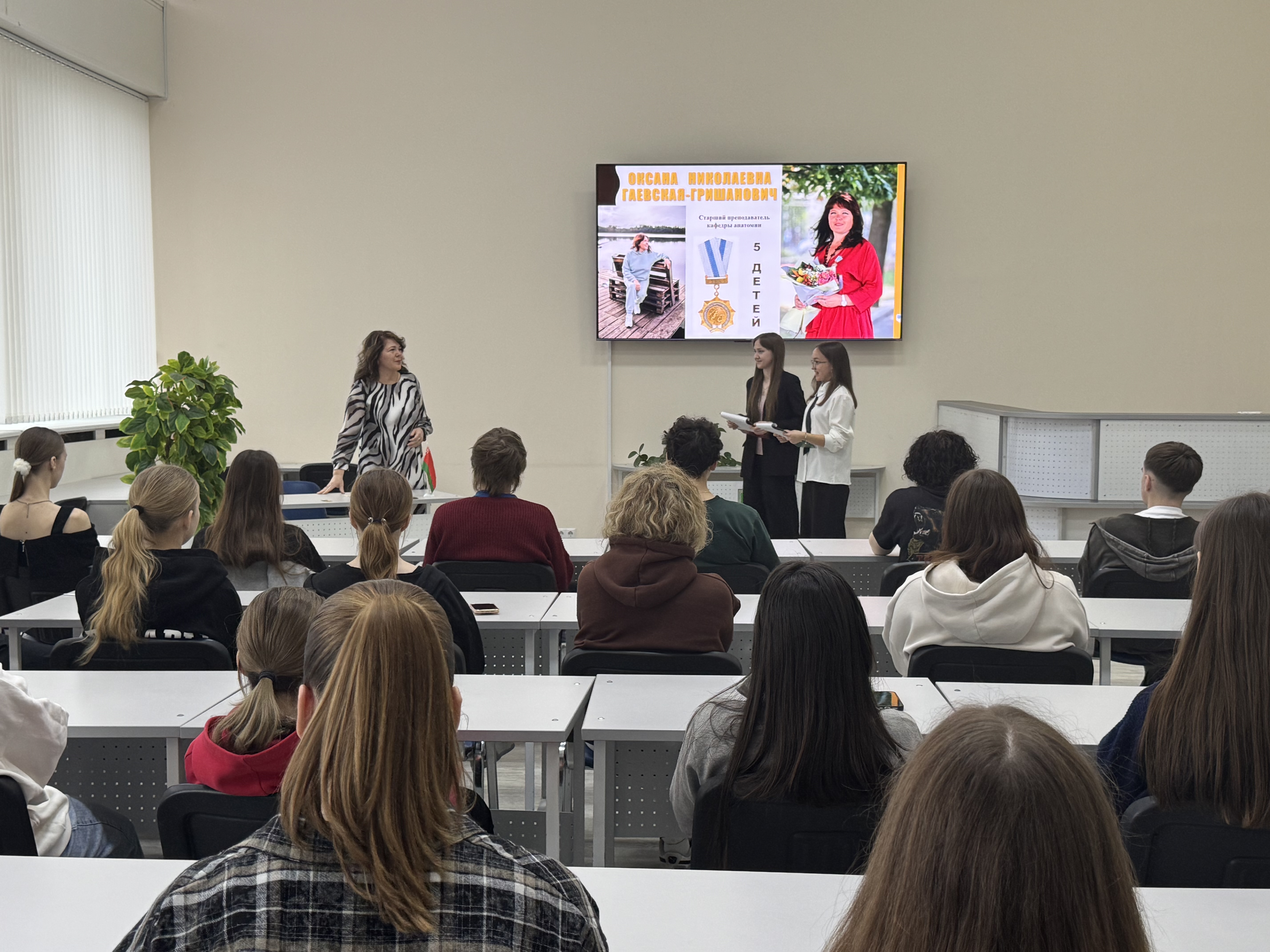 Также состоялся живой диалог с обсуждением реального опыта многодетного материнства, которым поделилась с присутствующими старший преподаватель кафедры анатомии Гаевская-Гришанович Оксана Николаевна, – мама пятерых детей, обладательница ордена Матери Республики Беларусь. Она рассказала о личных впечатлениях от воспитания детей, бытовых и социальных аспектах жизни большой семьи, а также ответила на многочисленные вопросы студентов. Участников интересовали темы распределения времени, организации досуга, финансового планирования.