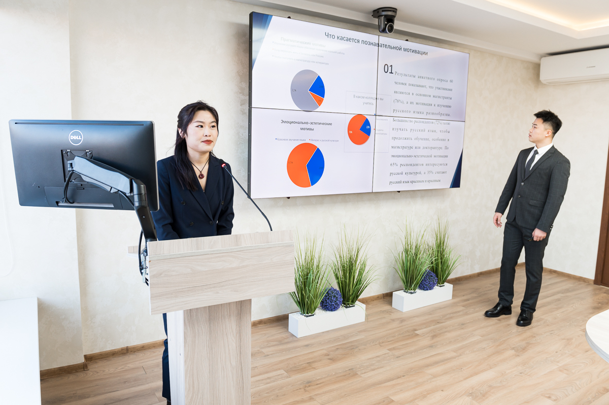 С первым докладом выступили магистранты Ван Янань и Ван Найюе. Они провели опрос 60 респондентов и представили на обсуждение исследование ключевых факторов изучения русского языка китайскими студентами в Белорусском государственном университете физической культуры, а также были рассмотрены их потребности в этом процессе.