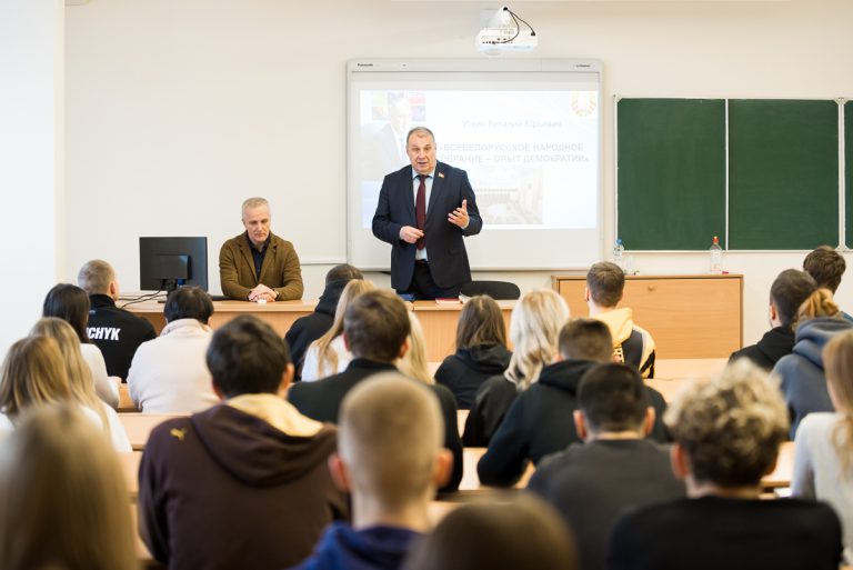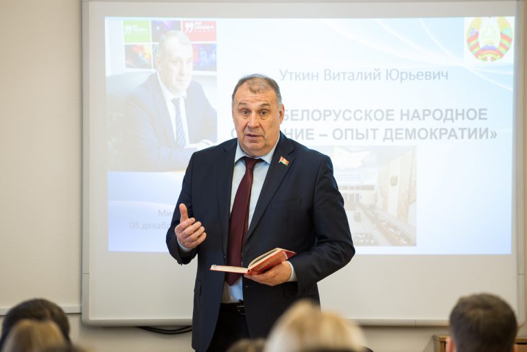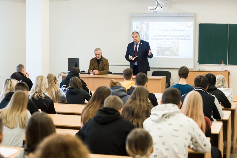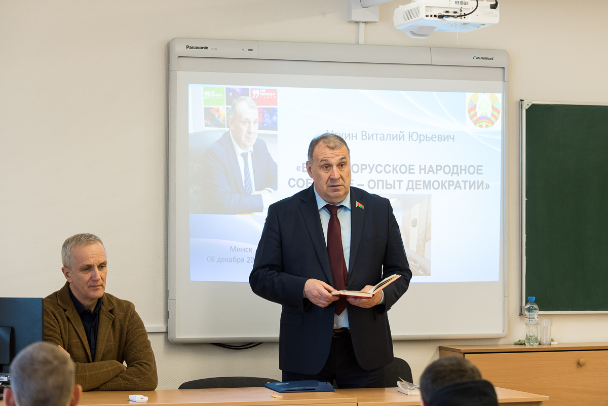 8 декабря, в рамках кураторского часа, на кафедре лёгкой атлетики состоялась встреча с депутатом Палаты представителей Национального собрания Республики Беларусь Уткиным Виталием Юрьевичем. Тема встречи «Всебелорусское народное собрание — опыт демократии».