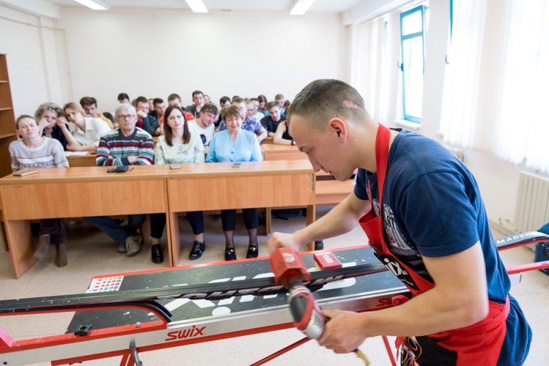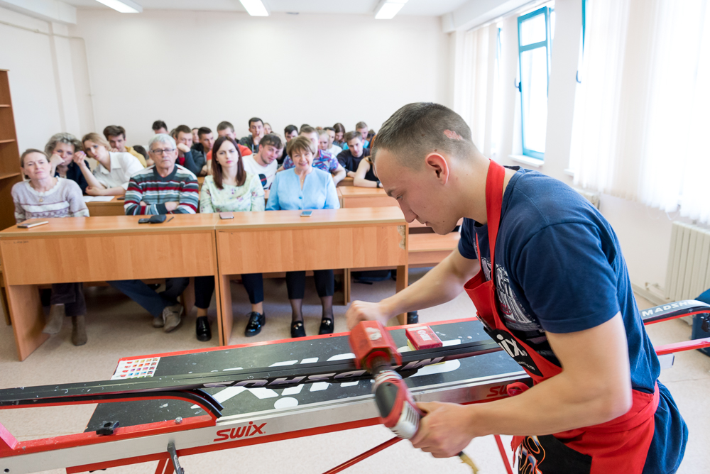 Студент 232 группы Евгений Федосов провел мастер–класс по технологии подготовки скользящей поверхности лыж.