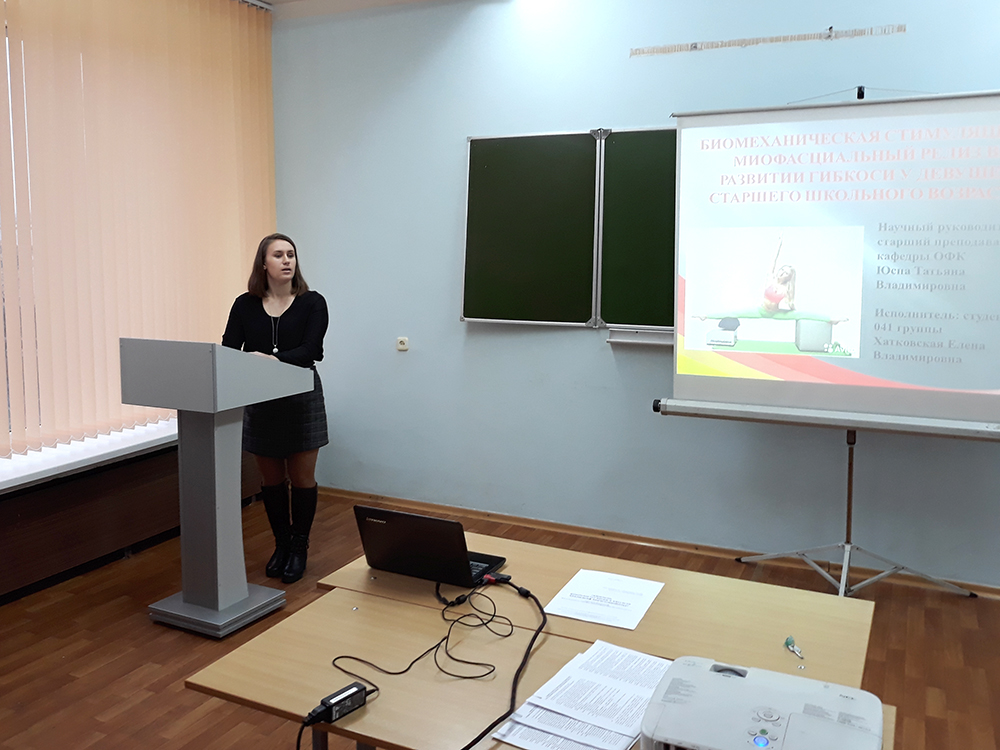 В ходе конференции молодые исследователи представили доклады на темы «Влияние вибромиостимуляции на показатели гибкости и силовые способности девушек 20-22 лет, занимающихся силовым тренингом», «Биомеханическая стимуляция и миофасциальный релиз в развитии гибкости у девушек старшего школьного возраста», «Изменение антропометрических данных у девушек 20-23 лет при занятиях в тренажерном зале», «Пропаганда оздоровительной физической культуры в ФОКе «Спарта» г.Лида» и др.