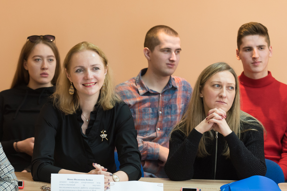 На кафедре спортивных игр прошла студенческая научно-практическая конференция. В мероприятии приняли участие профессорско-преподавательский состав кафедры, декан спортивно-педагогического факультета спортивных игр и единоборств Елена Планида, заместитель декана Жанна Шемет, ответственный за научную работу на спортивно-педагогическом факультете массовых видов спорта Наталья Юрчик, заведующий кафедрой велосипедного, конькобежного и конного спорта Михаил Дворяков, студенты и магистранты университета.