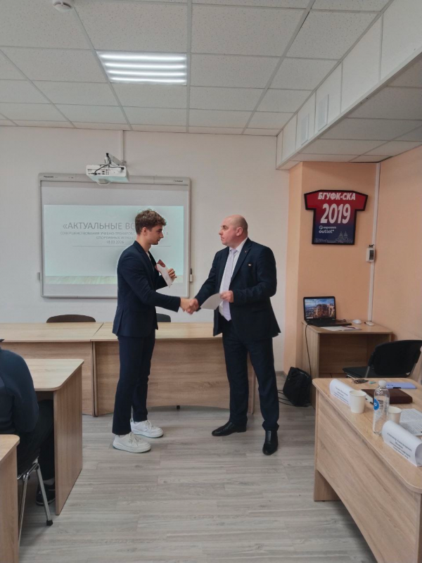 4. Щербицкий Арсений, студент 1302 группы, доклад по теме «Особенности атлетической подготовки гандболистов». Научный руководитель — Третьяк В.Л.