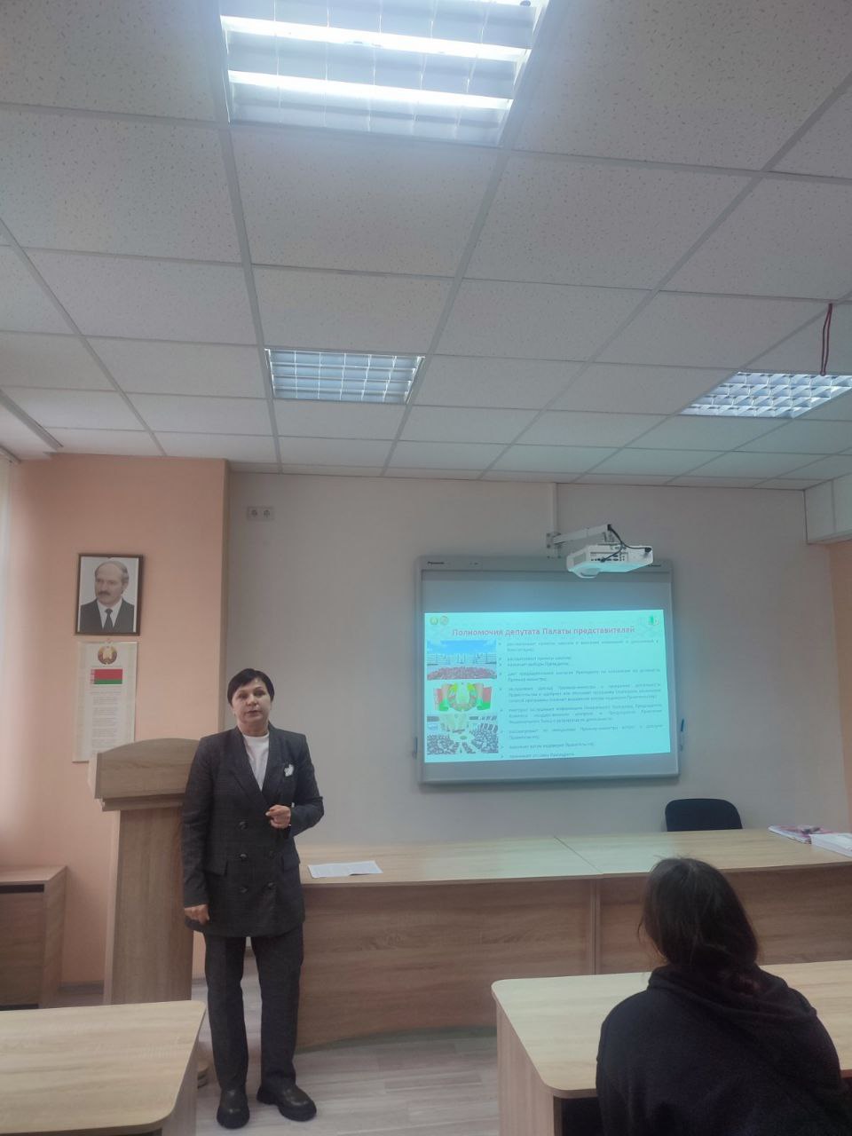 В завершении мероприятия в рамках «Школы избирателя» выступила заместитель декана по идеологической и воспитательной работе Карась Оксана Вячеславовна и рассказала о правовых основах электоральной компании в Республике Беларусь, компетенциях депутатов Палаты представителей и местных Советов депутатов, о правилах выдвижения кандидатов в депутаты, об организации и проведении выборов депутатов в единый день голосования.