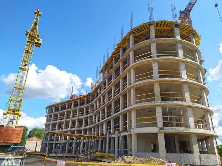 Монолитчики генподрядного СУ-7 Стройтреста № 4 завершили устройство плиты перекрытия над пятым этажом и перешли к монтажу опалубки на шестом. Всего на объекте трудятся около 80 человек, работают два крана. Сейчас параллельно с возведением монолитного каркаса каменщики кладут внутренние перегородки и наружные стены первого этажа.