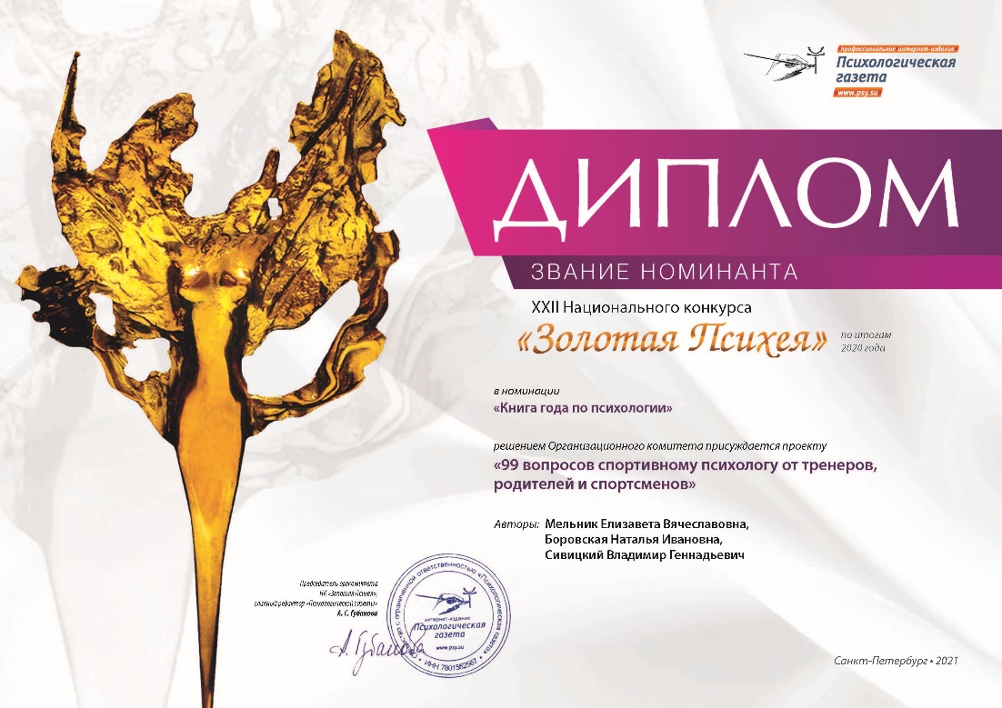 В номинации «Книга года по психологии» диплом получил проект «99 вопросов спортивному психологу от тренеров, родителей и спортсменов» за авторством Сивицкого Владимира Геннадьевича, Мельник Елизаветы Вячеславовны, Боровской Натальи Ивановны.
