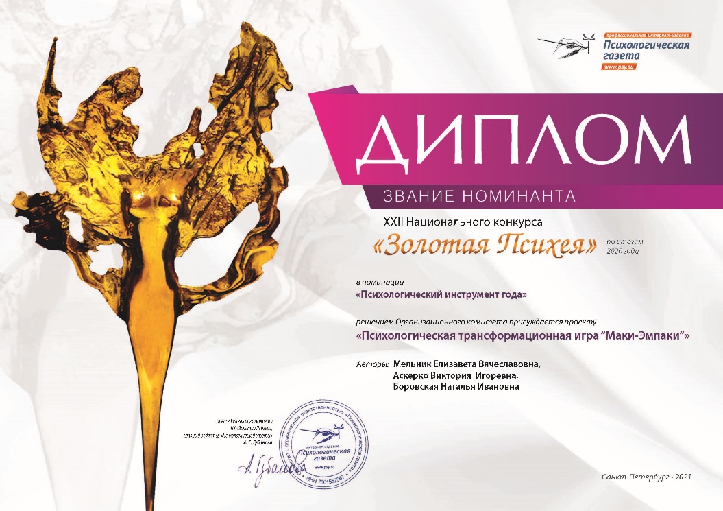 По итогам конкурса 2020 года решением Организационного комитета дипломом в номинации «Психологический инструмент года» был награжден проект «Психологическая трансформационная игра “Маки-Эмпаки”», авторы которой – сотрудники кафедры психологии БГУФК Мельник Елизавета Вячеславовна, Аскерко Виктория Игоревна и Боровская Наталья Ивановна.