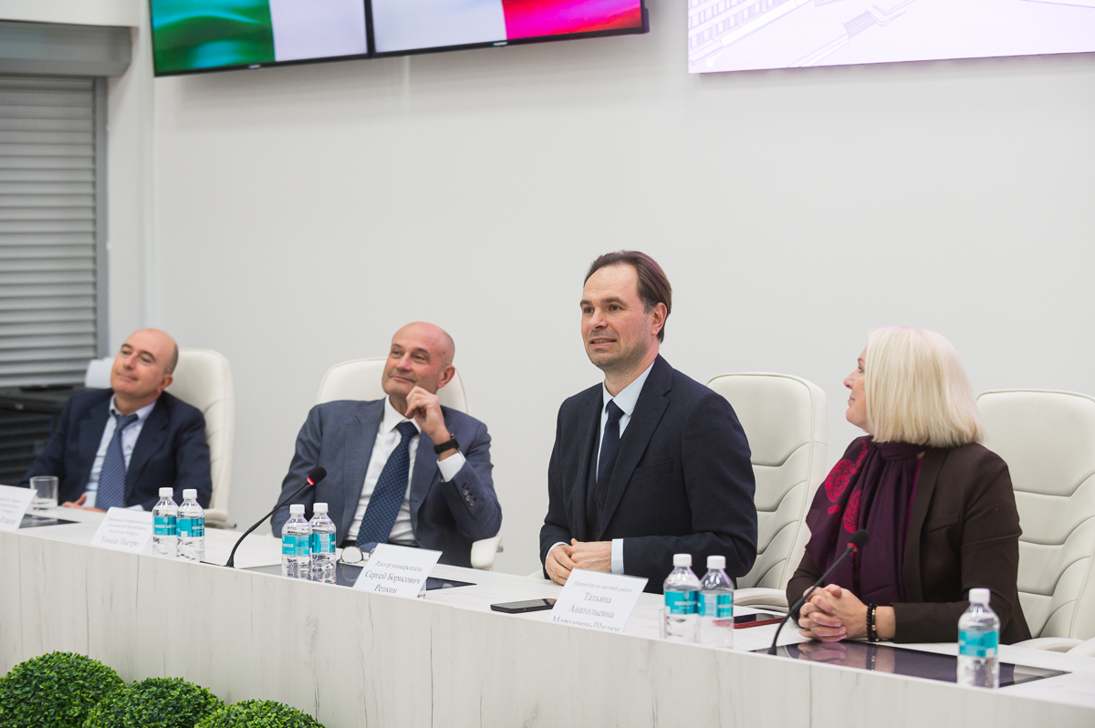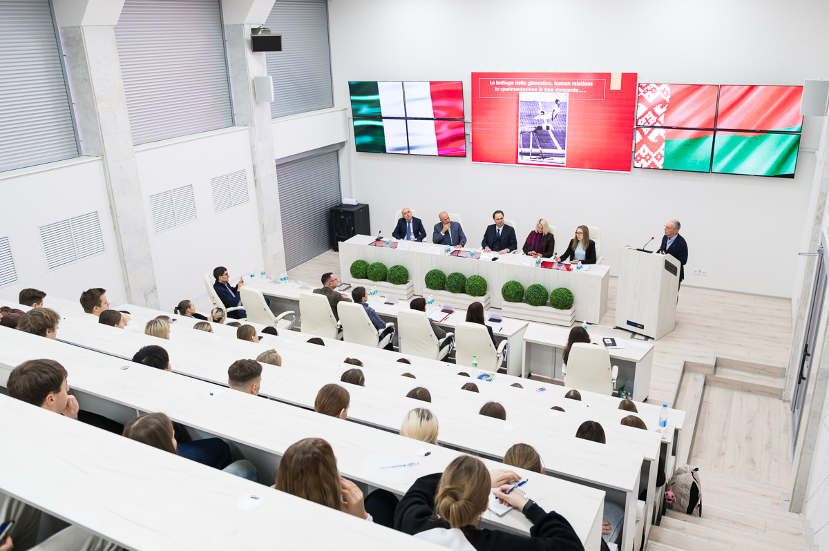 На мероприятии присутствовали: ректор университета Сергей Борисович Репкин, проректор по научной работе Татьяна Анатольевна Морозевич-Шилюк и председатель торговой палаты «Италия – Беларусь» Анджело Иларди.