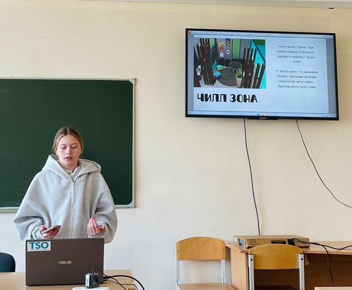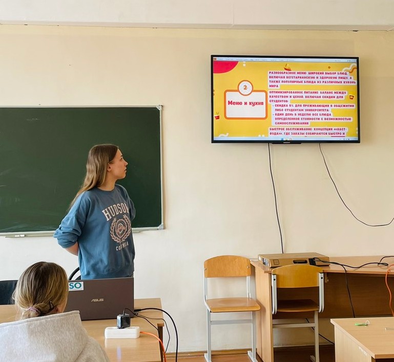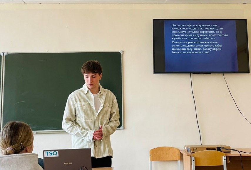 Студенты 415 и 435 группы кафедры менеджмента туризма и гостеприимства выступили со своими проектами концепции кафе, в которую входит: название, логотип, пример вывески, часы работы, целевая аудитория, дизайн интерьера, посуда, мебель, меню и цены, персонал (какие должности, сколько человек), дополнительные услуги.