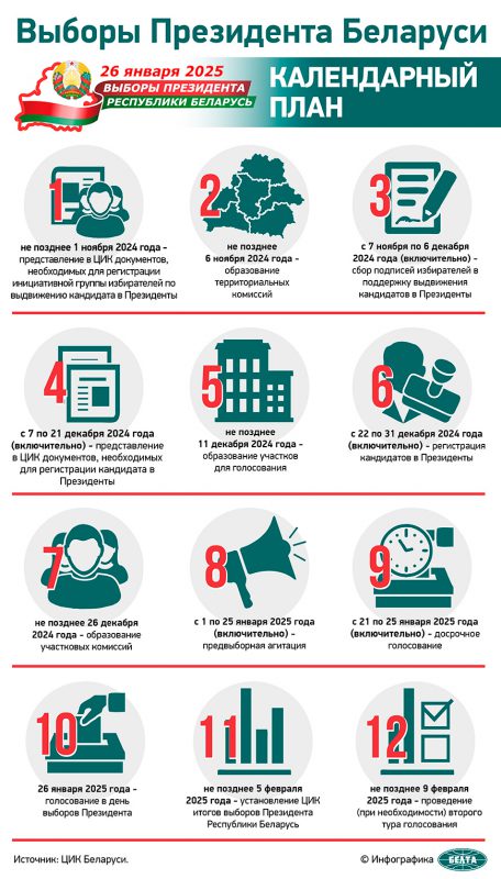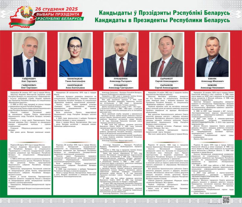 Выборы Президента Беларуси назначены на 26 января 2025 года. ЦИК зарегистрировал пять кандидатов в Президенты Республики Беларусь: действующий Президент Республики Беларусь Александр Лукашенко, председатель Республиканской партии труда и справедливости Александр Хижняк, председатель Либерально-демократической партии Беларуси Олег Гайдукевич, индивидуальный предприниматель Анна Канопацкая, первый секретарь Центрального комитета Коммунистической партии Беларуси Сергей Сыранков.