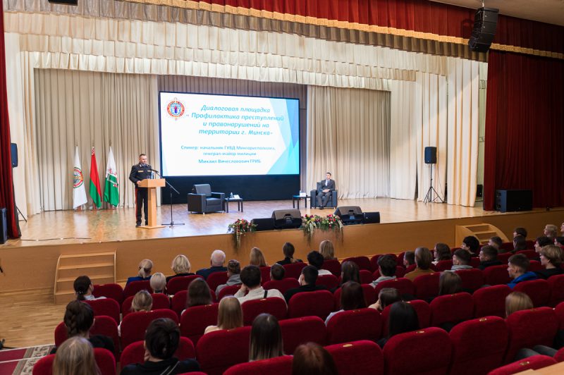 19 декабря в Белорусском государственном университете физической культуры состоялась диалоговая площадка «Профилактика преступлений и правонарушений на территории г. Минска» с начальником ГУВД Мингорисполкома, генерал-майором милиции Михаилом Вячеславовичем Грибом.
