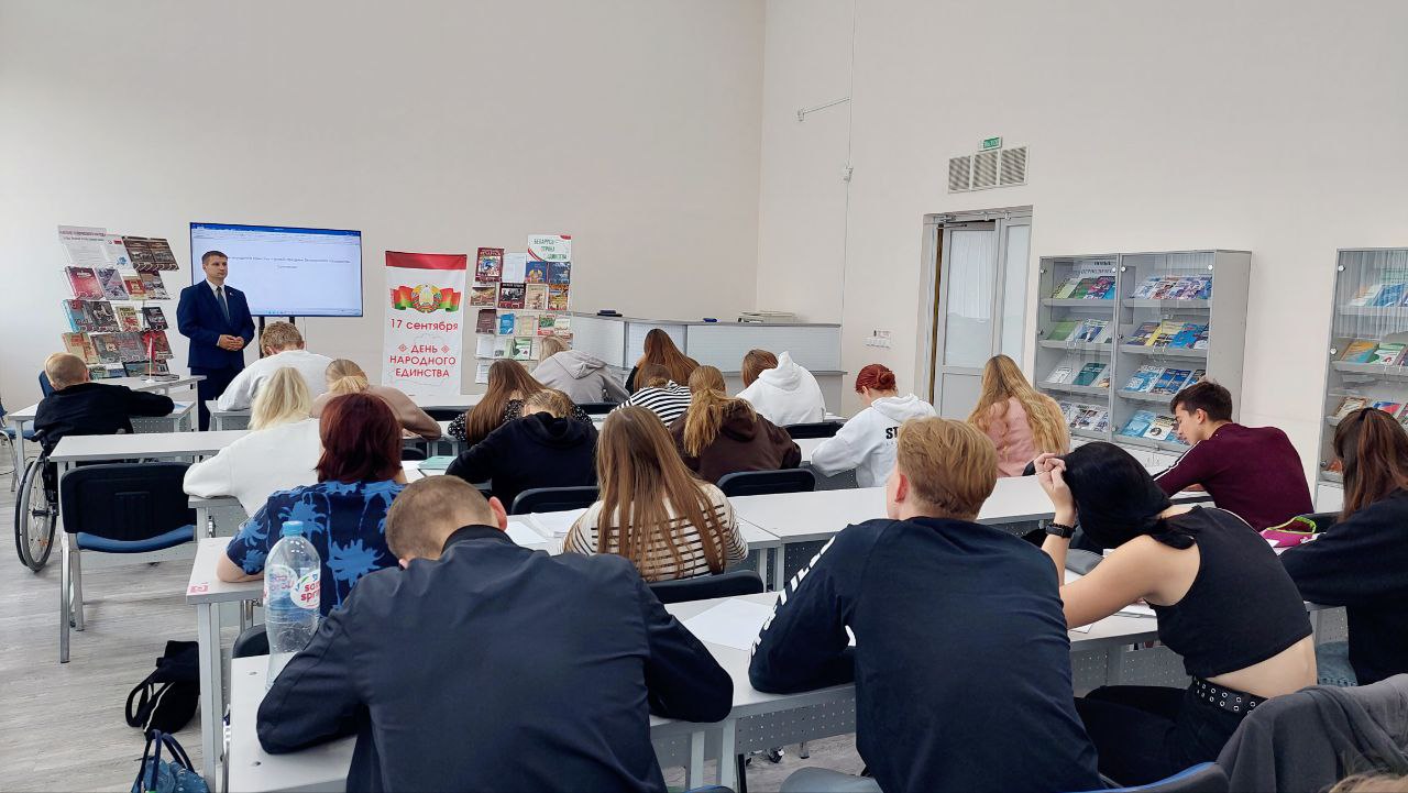 В рамках информационного часа, присутствующий на мероприятии заместитель начальника управления образования и социально-культурной сферы, начальник отдела образования и спорта Аппарата Совета Министров Республики Беларусь Гаптарь Виталий Марьянович предложил первокурсникам написать сочинение «День народного единства — новый праздник Белорусского государства», в котором студенты поделились своими размышлениями об истории и важности Дня народного единства для каждого из нас.