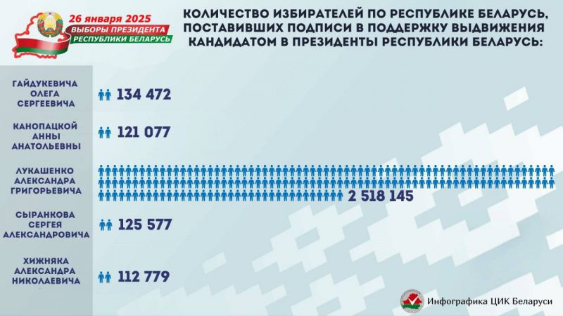 По результатам проверки достоверности подписей в подписных листах, на основании протоколов областных, Минской городской комиссий по выборам Президента Республики Беларусь об установлении количества избирателей, поставивших подписи в поддержку выдвижения кандидатов в Президенты Республики Беларусь, ЦИК Беларуси установлено количество избирателей по Республике Беларусь, поставивших подписи в поддержку выдвижения кандидатов в Президенты Республики Беларусь.