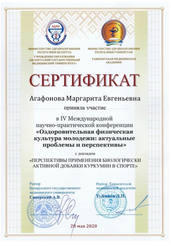 По окончанию конференции участникам были вручены сертификаты. Поздравляем Маргариту Евгеньевну Агафонову с успешными выступлениями и желаем дальнейшей плодотворной научной деятельности!