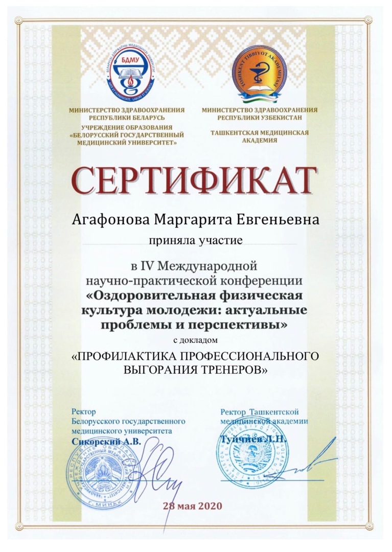 В рамках научного мероприятия Маргарита Евгеньевна выступила с двумя докладами: «Перспективы применения биологически активной добавки куркумин в спорте» и «Профилактика профессионального выгорания тренеров». Также М.Е. Агафонова являлась модератором на одной из секций конференции — «Секция 2. Инновационные технологии, формы, средства и методы оздоровительной физической культуры учащихся и студентов».
