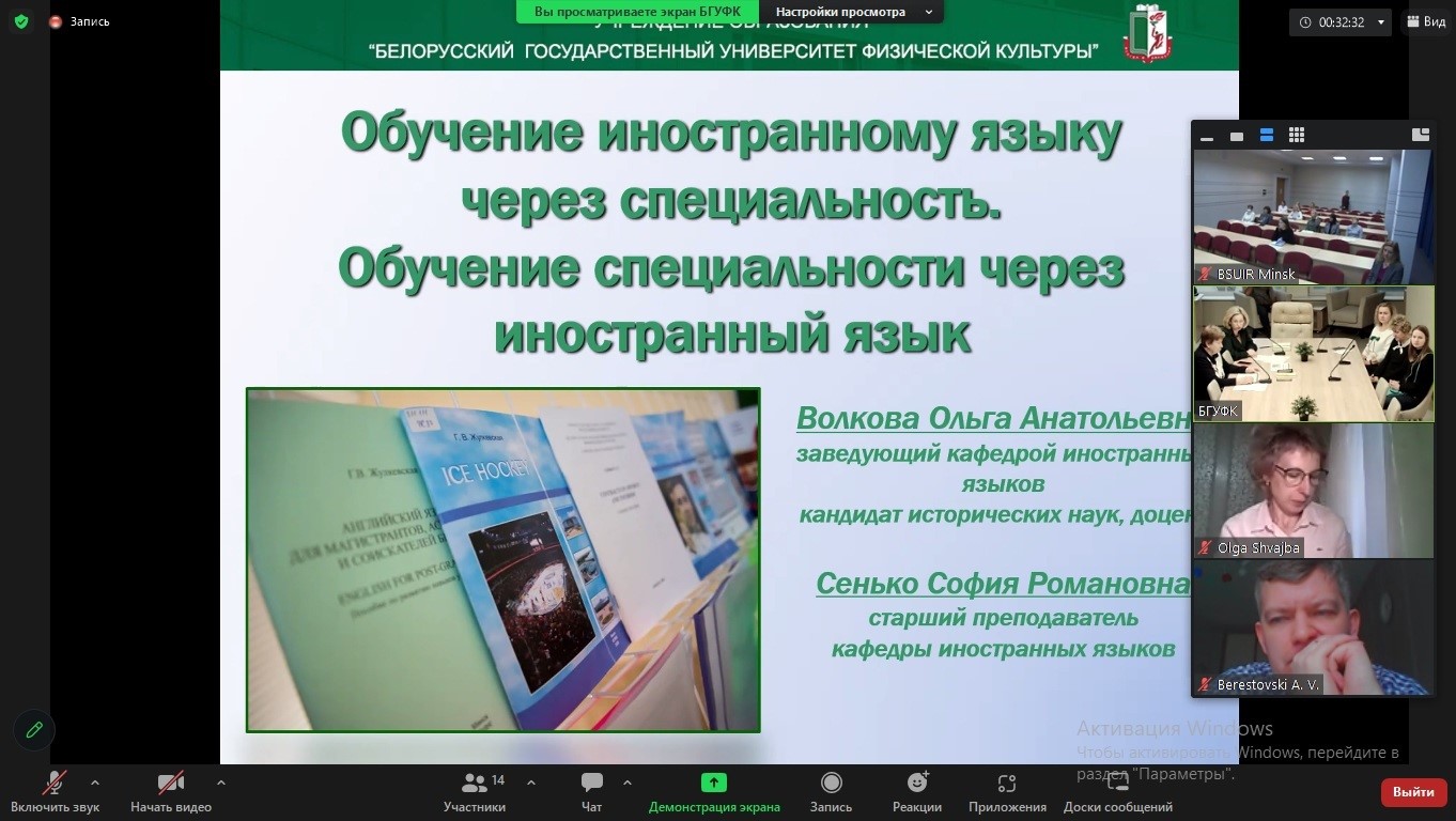 19 января 2023 года кафедра иностранных языков факультета оздоровительной физической культуры, по приглашению кафедры межкультурной профессиональной коммуникации Белорусского государственного университета информатики и радиоэлектроники, приняла участие в работе II Межвузовского научно-методического семинара «Обучение иноязычной профессиональной коммуникации в диалоге культур: достижения и перспективы» (в формате онлайн). Участниками стали преподаватели Белорусского государственного университета информатики и радиоэлектроники, Белорусского государственного университета физической культуры, Белорусского государственного университета, Минского государственного лингвистического университета.