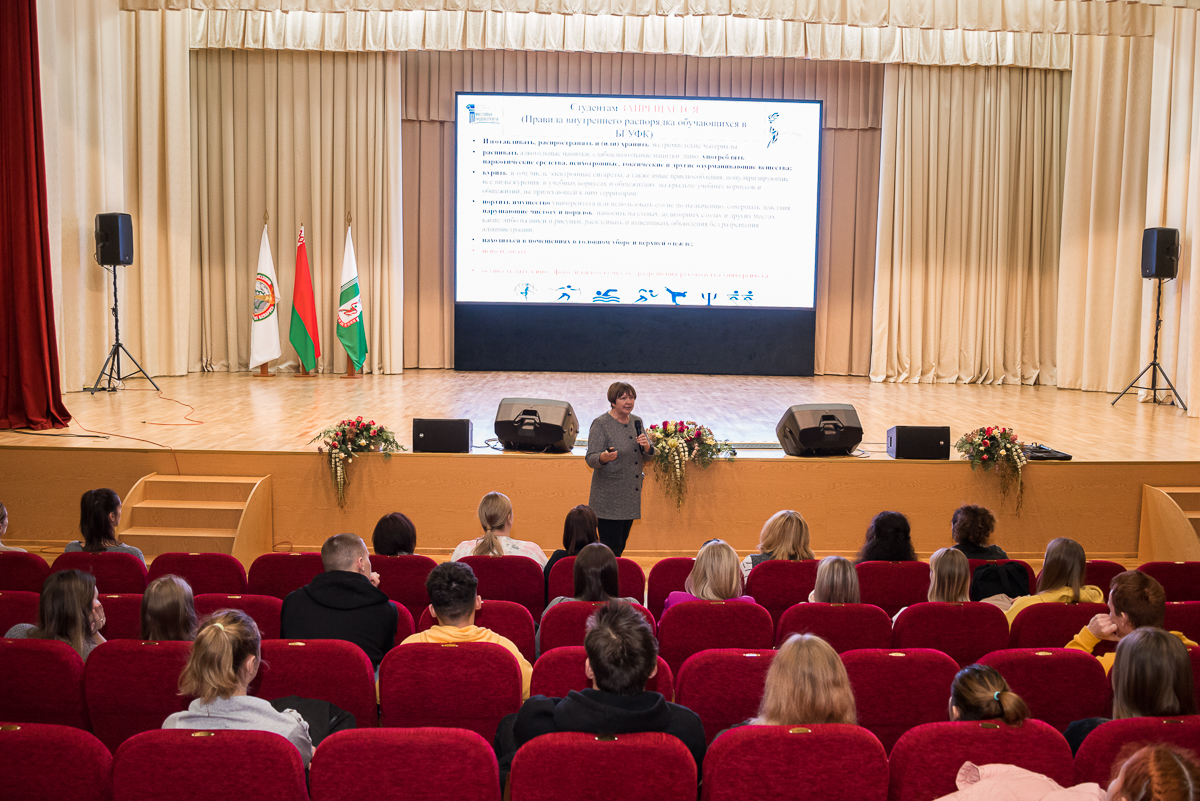 В рамках профилактики любых форм аддиктивного поведения обучающихся, 13.12.2022 года состоялась очередная встреча декана спортивно-педагогического факультета массовых видов спорта И.И.Гуслистовой со студентами нашего университета, проживающими в общежитиях. На мероприятии обсуждались важные вопросы по реализации требований Правил внутреннего распорядка для обучающихся в университете, законов Республики Беларусь «О наркотических средствах, психотропных веществах, их прекурсорах и аналогах», «О борьбе с коррупцией» и «О защите персональных данных».