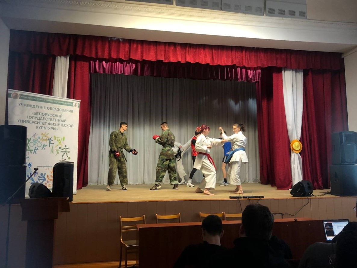 С концертной программой выступили студенты факультета оздоровительной физической культуры и представитель коллектива «Театр гимнастики». Обучающиеся спортивно-педагогического факультета массовых видов спорта порадовали участников мероприятия показательными выступлениями по карате, рукопашному бою, таэквондо, а обучающиеся спортивно-педагогического факультета спортивных игр и единоборств — вокальными номерами.