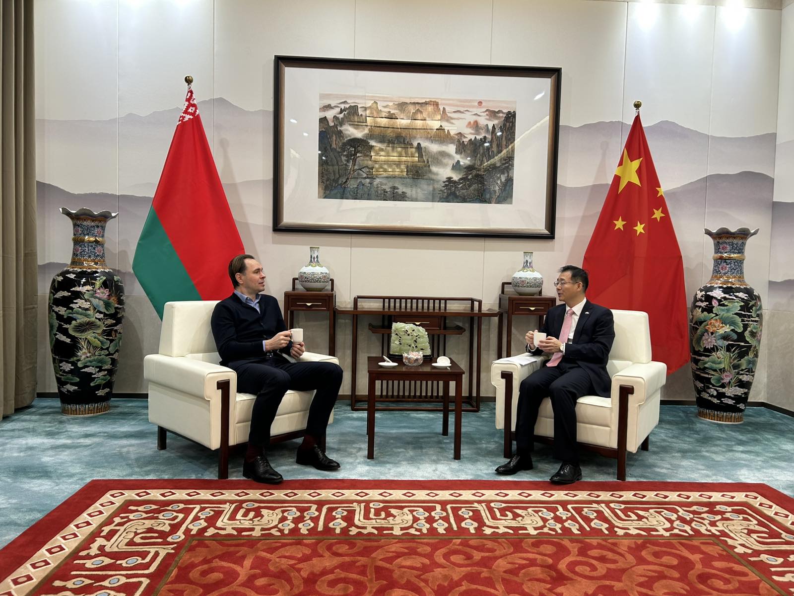 В рамках визита Сергей Борисович вместе с Наталией Владимировной Костеевой, директором Института Конфуция БГУФК с белорусской стороны и Сун Пэном, директором Института Конфуция БГУФК с китайской стороны встретились с Чрезвычайным и Полномочным Послом Китайской Народной Республики в Республике Беларусь господином Чжан Вэньчуанем.