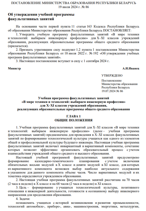 1. Утверждена Постановлением Министерства образования Республики Беларусь от 19.07.2024 № 88 и опубликована на национальном образовательном портале учебная программа факультативных занятий «Введение в спортивно-педагогические профессии» для учащихся X–XI классов учреждений образования, реализующих образовательные программы общего среднего образования.