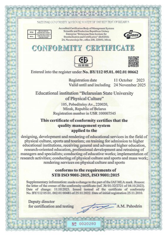 Система менеджмента качества Белорусского Государственного Университета Физической Культуры функционирует с 2010 года. 9 ноября 2010 г. органом по сертификации систем управления БелГИСС в университете был проведен сертификационный аудит, по результатам которого 25 ноября 2010 г. университет получил национальный сертификат соответствия СТБ ISO 9001-2009 и международный сертификат немецкой системы аккредитации (TGA) DIN EN ISO 9001:2008. В течение двух последующих лет университет успешно проходил инспекционные аудиты, а 25 ноября 2013 года органом по сертификации систем управления БелГИСС был проведен повторный сертификационный аудит, по результатам которого действие сертификатов соответствия было продлено до 2016 года.