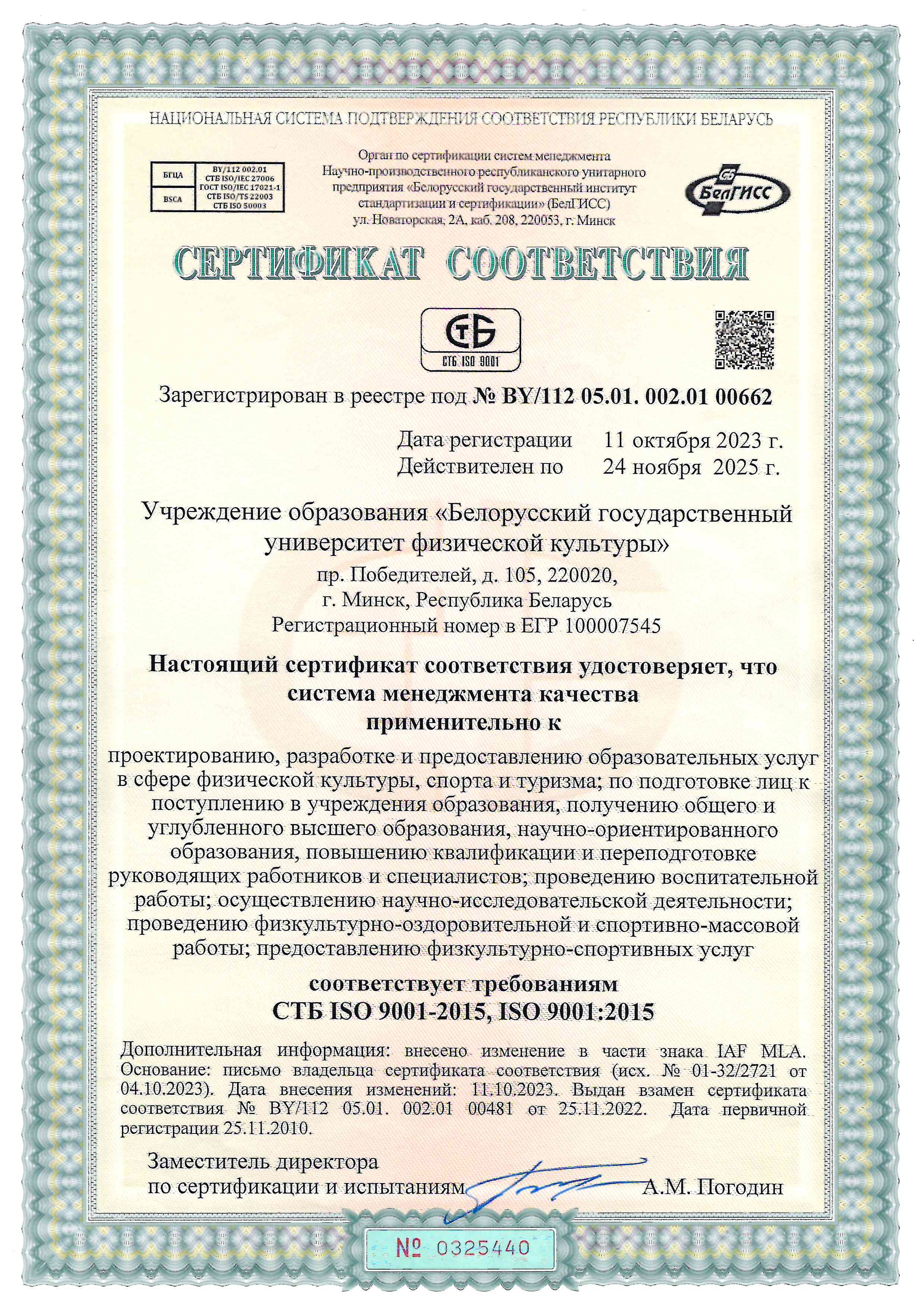 Последующие инспекционные аудиты и повторный сертификационный аудит в сентябре 2016 года подтвердили зрелость системы менеджмента качества университета. В сентябре 2017 года при проведении инспекционного контроля университет успешно осуществил переход на новую версию стандарта СТБ ISO 9001-2015. На сегодняшний день срок действия национального сертификата соответствия СТБ ISO 9001-2015 и международного сертификата ISO 9001:2015 продлен до 24 ноября 2025 года.