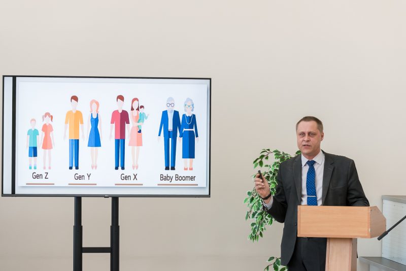 Перед аудиторией на семинаре выступил кандидат философских наук, доцент кафедры психологии и педагогики академии Министерства внутренних дел Республики Беларусь Федор Викторович Пекарский, который рассказал, какие социальные институты влияют на социализацию подрастающего поколения, охарактеризовал выделенные типы поколений, описал их качество, потребности, ценностные ориентиры.
