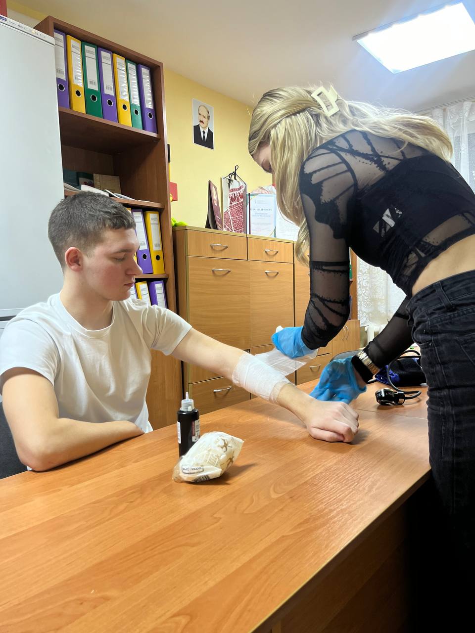 Члены совета общежития, педагогические работники Городович Алексей Михайлович, Заяш Николай Александрович делились с учащимися своим знаниями, умениями и навыками по оказанию первой медицинской помощи пострадавшим при получении ссадин, ушибов, ран, ожогов, кровотечений, переломов, отравлений, обмороков, проблем с артериальным давлением и многим другим, что угрожает жизни и здоровью человека по алгоритму: симптомы, причины, помощь, рекомендации.