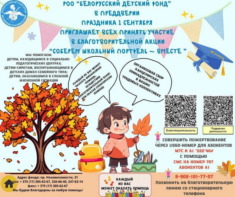 В преддверии 1 сентября — Дня знаний — Белорусский детский фонд приглашает всех принять участие в благотворительной акции «Соберем школьный портфель – вместе».