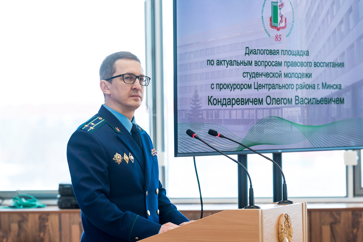 10 марта в конференц-зале легкоатлетического манежа состоялась диалоговая площадка по актуальным вопросам правового воспитания студенческой молодежи с прокурором Центрального района Кондаревичем Олегом Васильевичем.