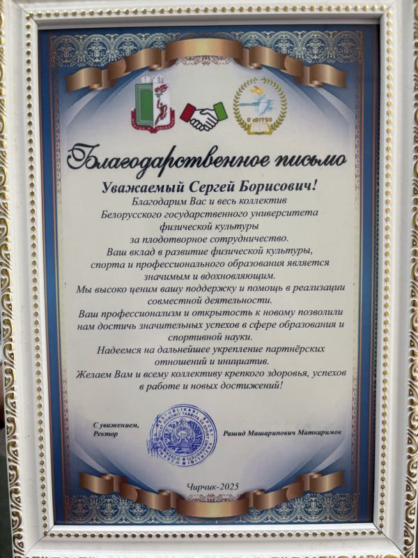 В период с 27 мая по 3 июня 2025 года состоялась итоговая аттестация магистрантов и студентов совместного факультета «Физическая культура, спорт и туризм», созданного в рамках совместной образовательной программы с учреждением образования «Узбекский государственный университет физической культуры и спорта». Сдача государственных экзаменов и защита магистерских диссертаций в государственной экзаменационной комиссии проходила в онлайн-формате. Со стороны БГУФК работала государственная экзаменационная комиссии в составе: