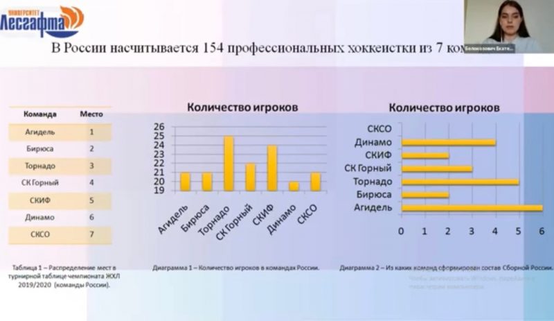 Второй доклад на тему «Проблемы профессионального женского хоккея в Росии» представила Екатерина Белокозович (магистрант НГУ имени П.Ф. Лесгафта, г. Санкт-Петербург). Были озвучены основные факторы, негативно отражающиеся на профессиональном женском хоккее, а также возможности их решения.