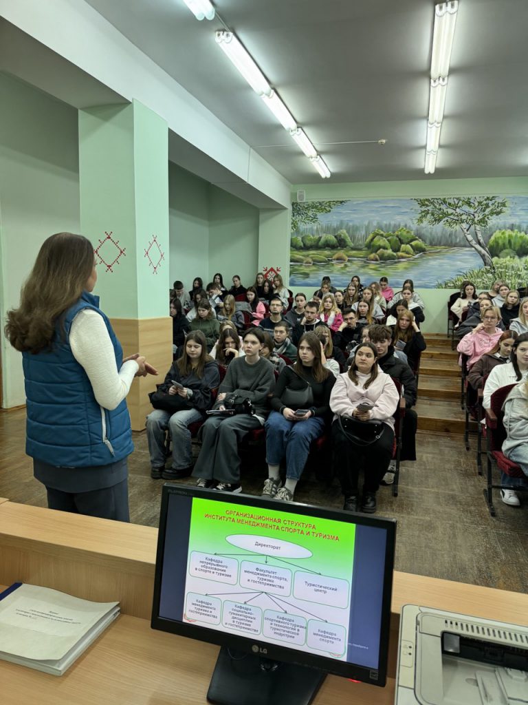 Профориентационную встречу с абитуриентами провела заместитель декана факультета менеджмента спорта, туризма и гостеприимства Института менеджмента спорта и туризма Елена Васильевна Фильгина.