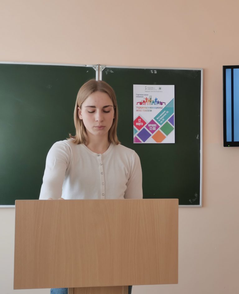 На конференции с устными докладами выступили студенты 4 курса кафедры технологий фитнеса: Воронцова Екатерина (040 группа), Дичковская Алеся (040 группа), Чайка Анастасия (040 группа), Мысливчик Ксения (040 группа), Предёха Мария (040 группа).