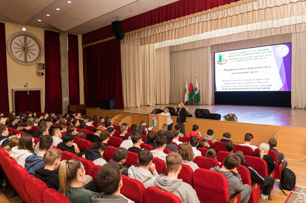 12 марта 2024 года в актовом зале университета состоялась встреча сотрудников и студентов-первокурсников спортивно-педагогического факультета спортивных игр и единоборств с врачом-психиатром-наркологом учреждения здравоохранения «Минский городской клинический наркологический центр» Ириной Евгеньевной Кофановой.