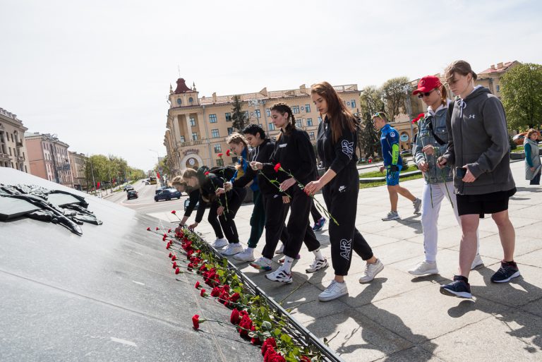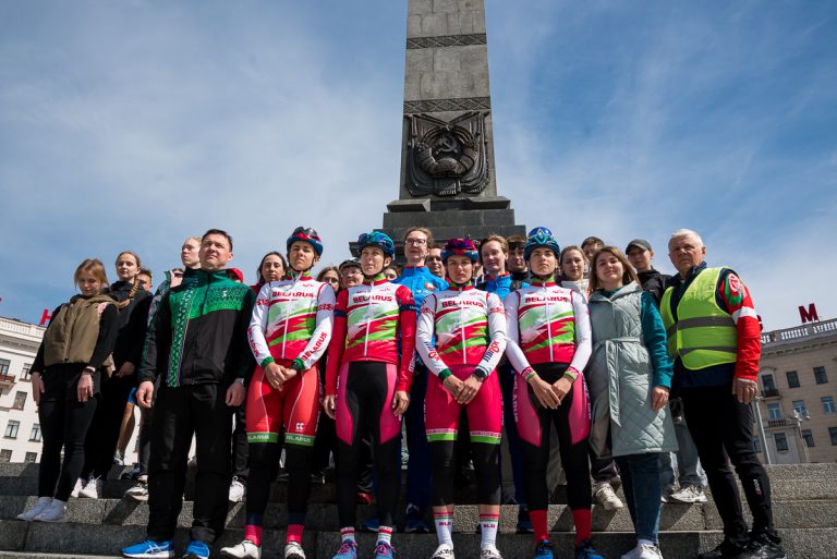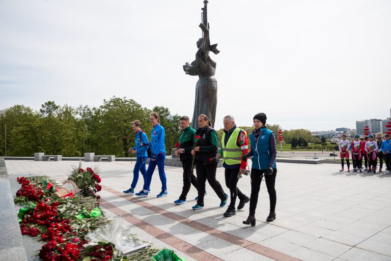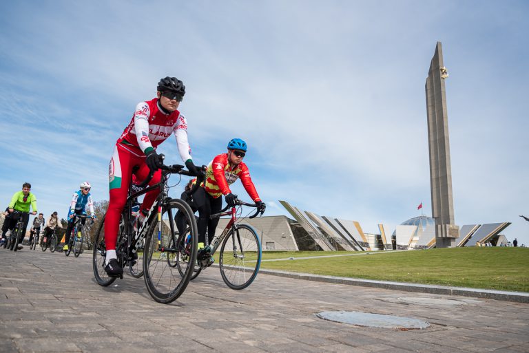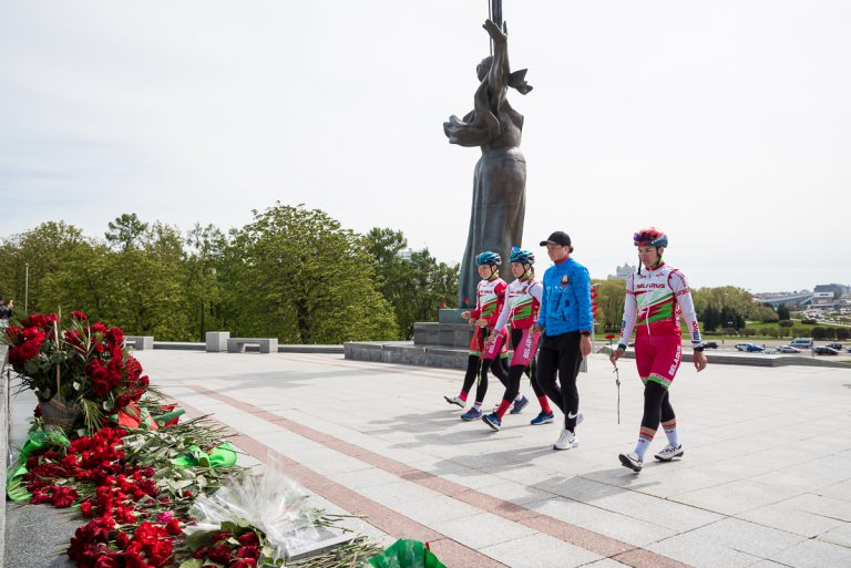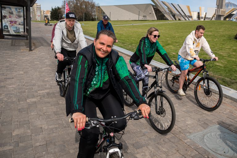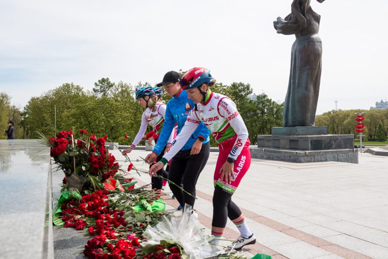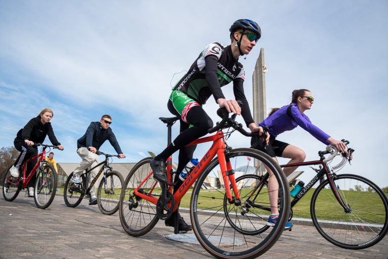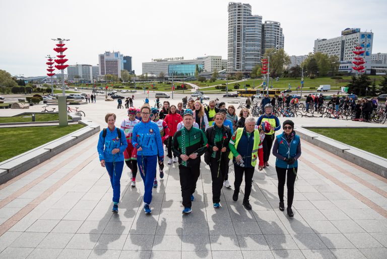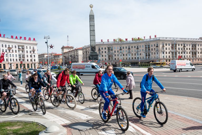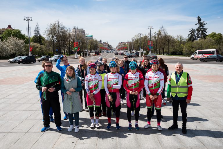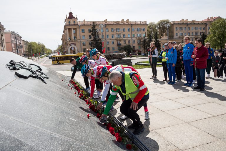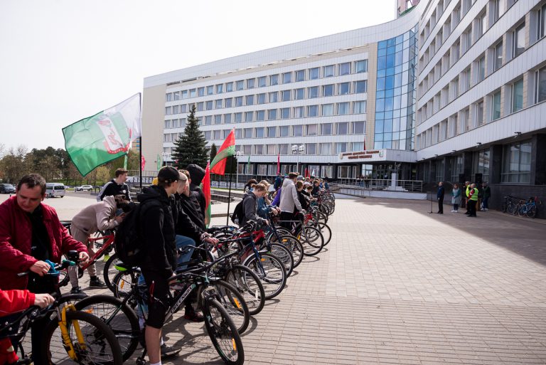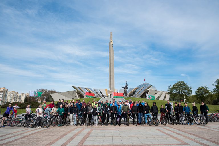 Первый проректор дал торжественный старт велопробегу и велосипедисты отправились по маршруту: стела «Минск город-герой» — памятник «Марату Казею» — площадь Победы.