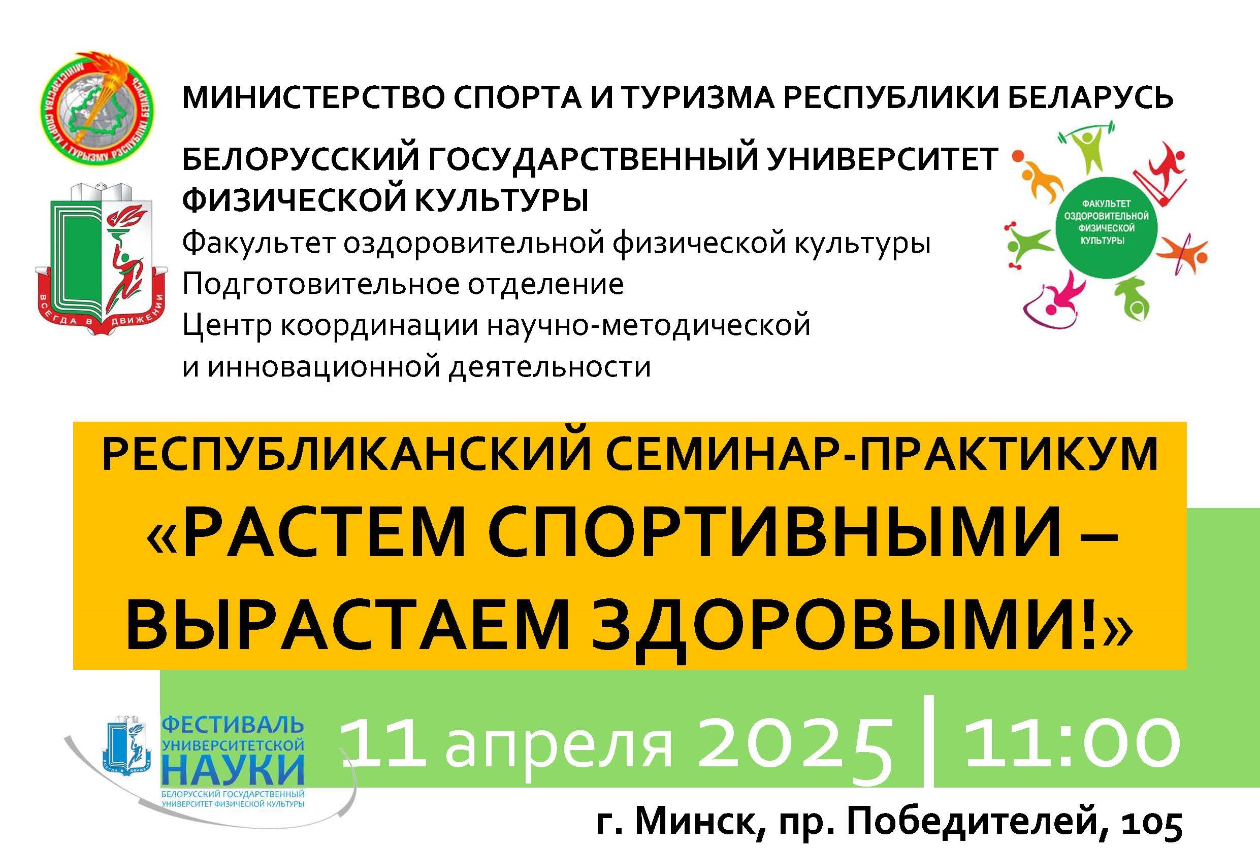 Белорусский государственный университет физической культуры 11 апреля провел Республиканский семинар-практикум «Растем спортивными – вырастаем здоровыми!», который прошел в заключительный день Фестиваля университетской науки. Площадка объединила преподавателей учреждений высшего образования, учителей учреждений общего среднего образования, студентов и учеников старших классов, что создало продуктивную среду для обмена опытом и знаниями по использованию возможностей физической культуры и спорта для обеспечения здорового образа жизни и представления нестандартных решений и идей по данному направлению.