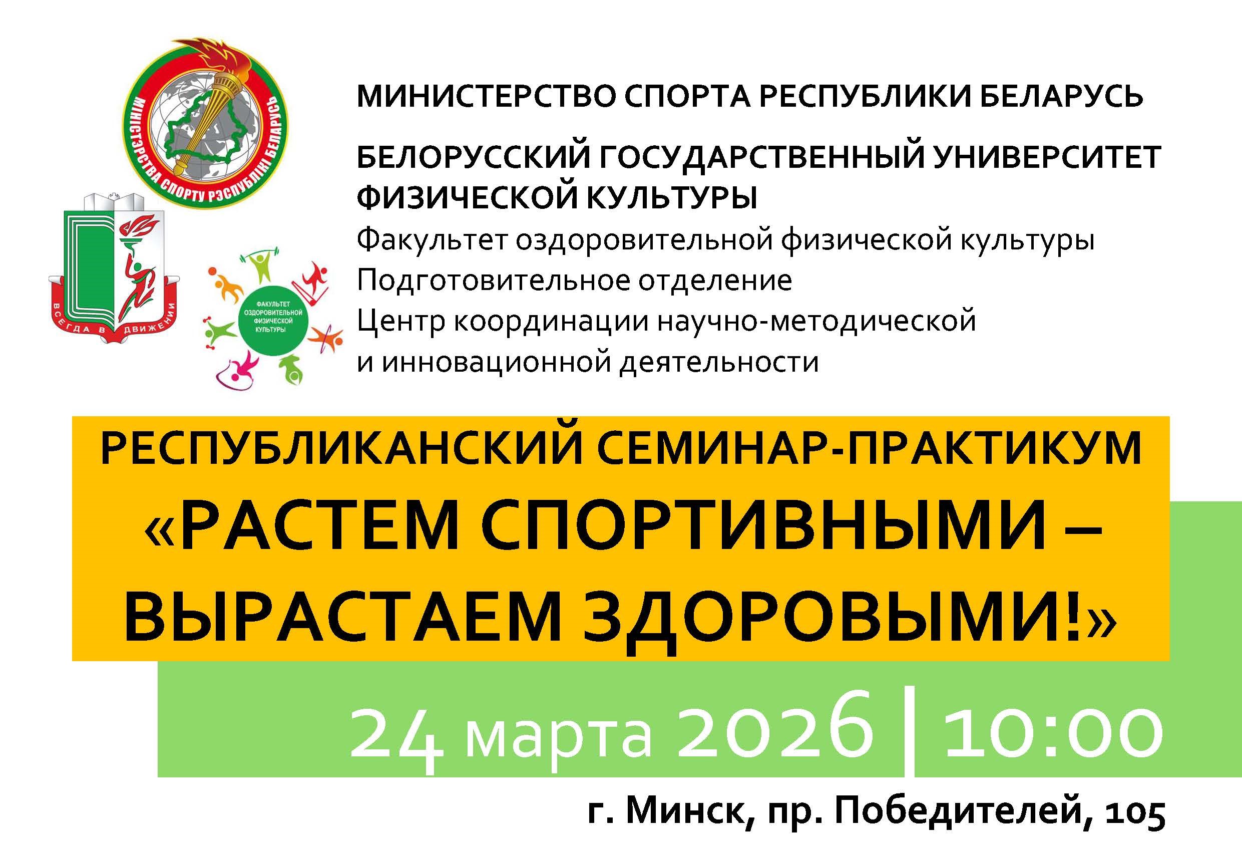 Белорусский государственный университет физической культуры приглашает преподавателей учреждений высшего и среднего специального образования, учителей учреждений общего среднего образования, студентов и учащихся учреждений высшего и среднего специального образования, учеников старших классов учреждений  общего среднего образования, в том числе обучающихся в профильных классах спортивно-педагогической направленности и специализированных по спорту классах, принять участие 24 марта 2026 года в Республиканском семинаре-практикуме «Растем спортивными – вырастаем здоровыми!».
