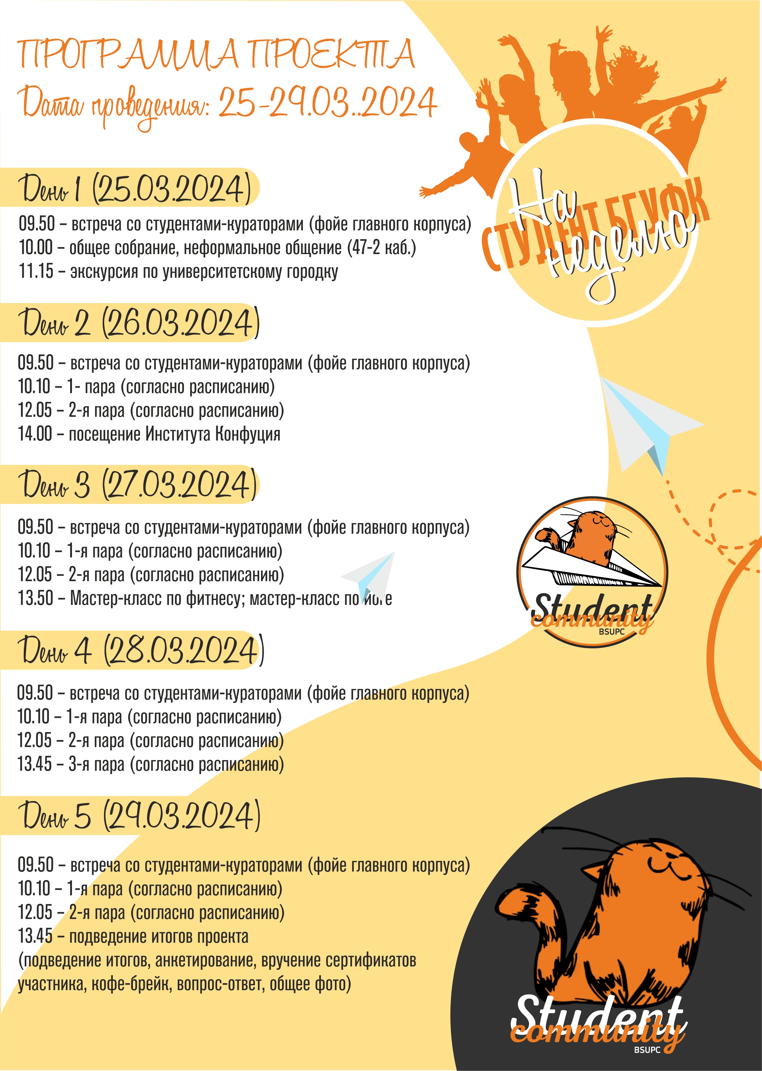 25 марта в университете стартовал проект «Студент БГУФК на неделю». В роли студентов БГУФК смогут себя попробовать 39 учащихся 10-11 классов средних школ, гимназий, лицеев, колледжей, которые планируют получить высшее образование.