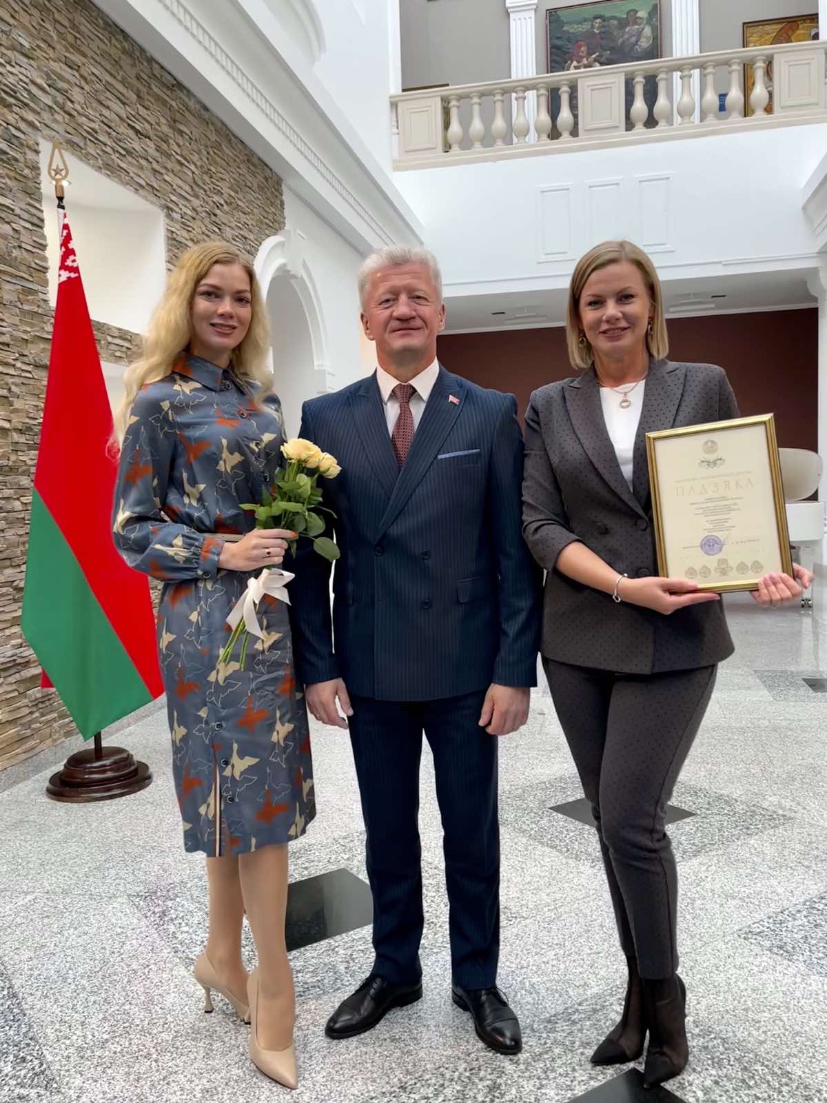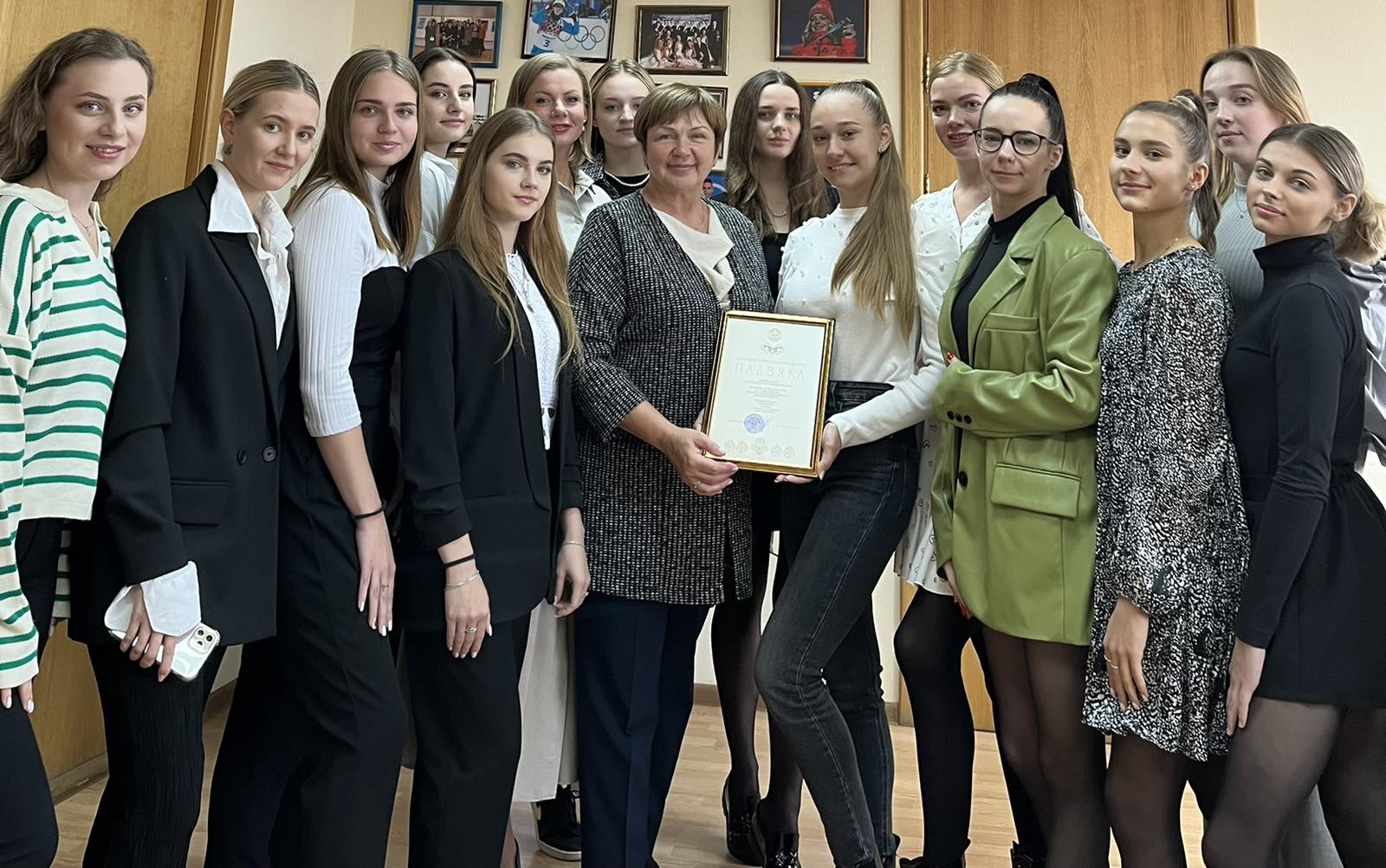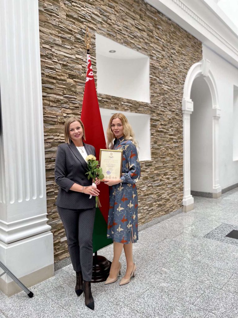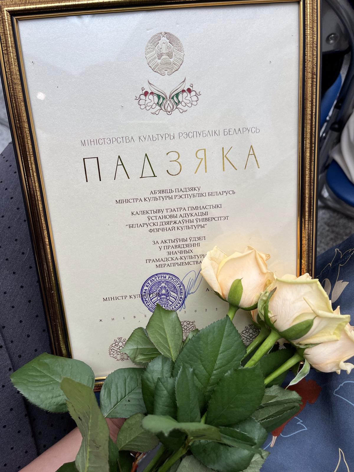 Торжественная церемония награждения прошла 13 сентября в Национальном художественном музее и была приурочена ко Дню народного единства. Благодарность руководителям коллектива, старшим преподавателям кафедры гимнастики Макаровой Марии Витальевне и Боринской Алине Павловне вручил министр культуры Маркевич Анатолий Мечиславович.