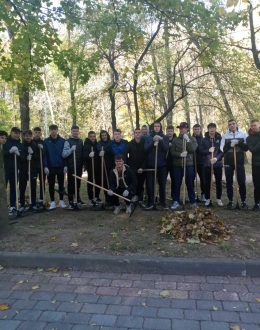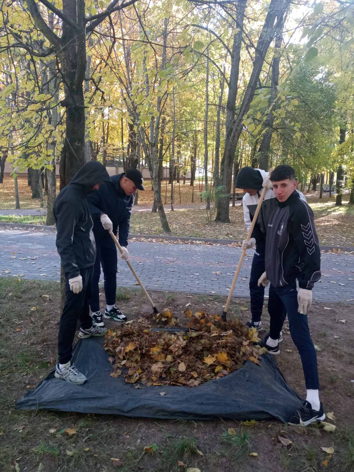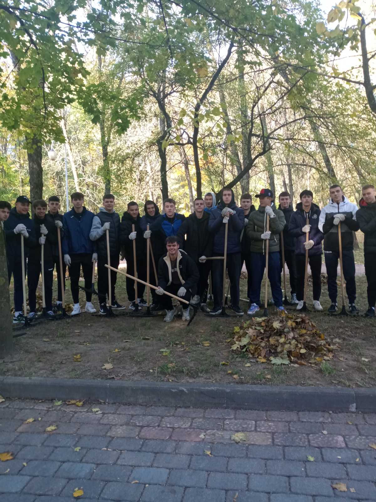 Трудовой десант будущих тренеров-преподавателей, специализирующихся в игровых видах спорта (волейболе, баскетболе, футболе, хоккее, теннисе, шахматах), фигурном катании, велоспорте и единоборствах (спортивной борьбе, самбо, дзюдо) выполнили план по уборке листьев на территориях БГУФК, парка Победы и улицы Веснинка.