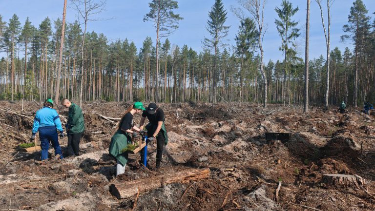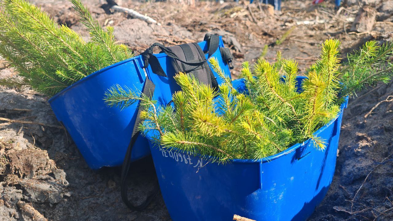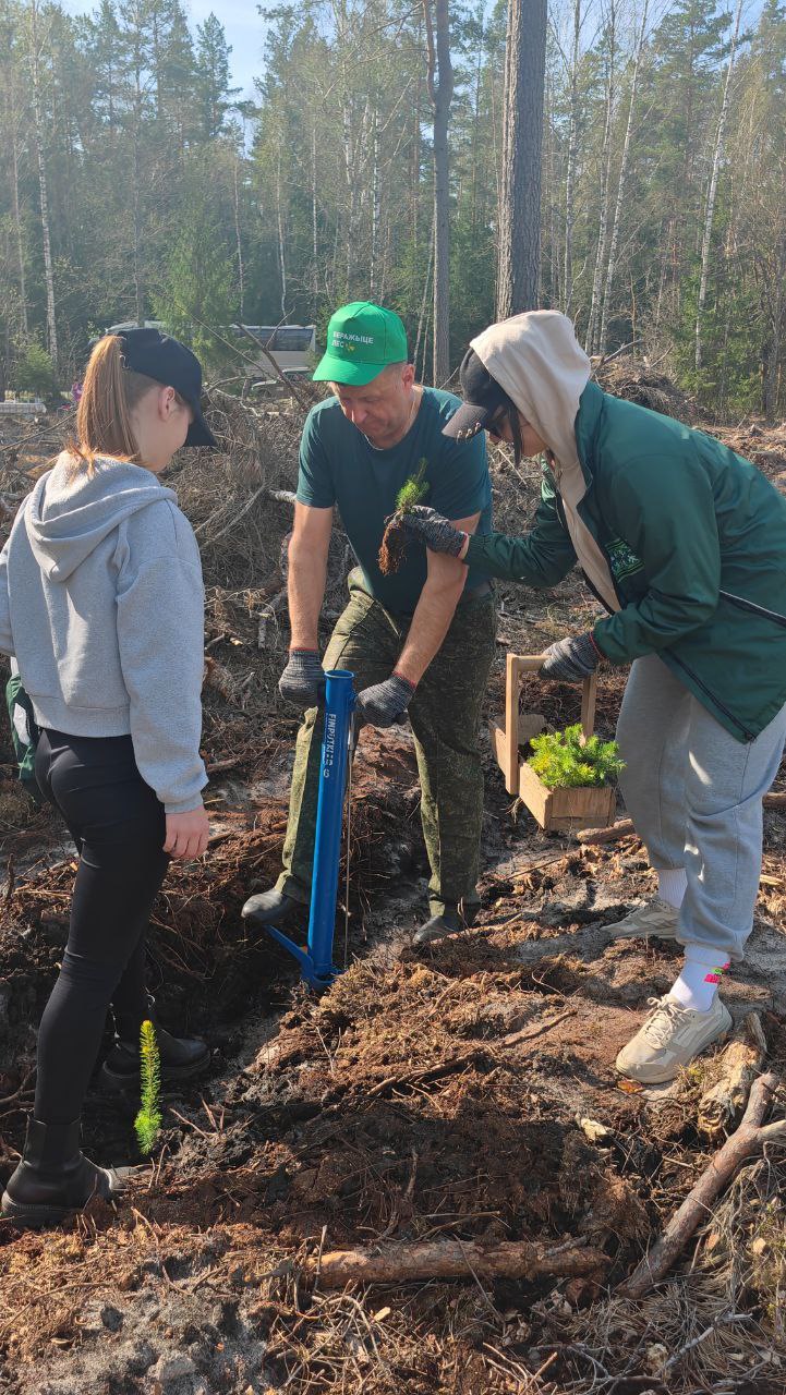 Старт работам был дан в 10:00 и на протяжении четырех часов были высажены молодые однолетние саженцы сосен и елей.