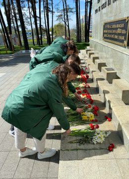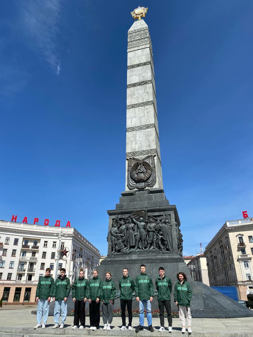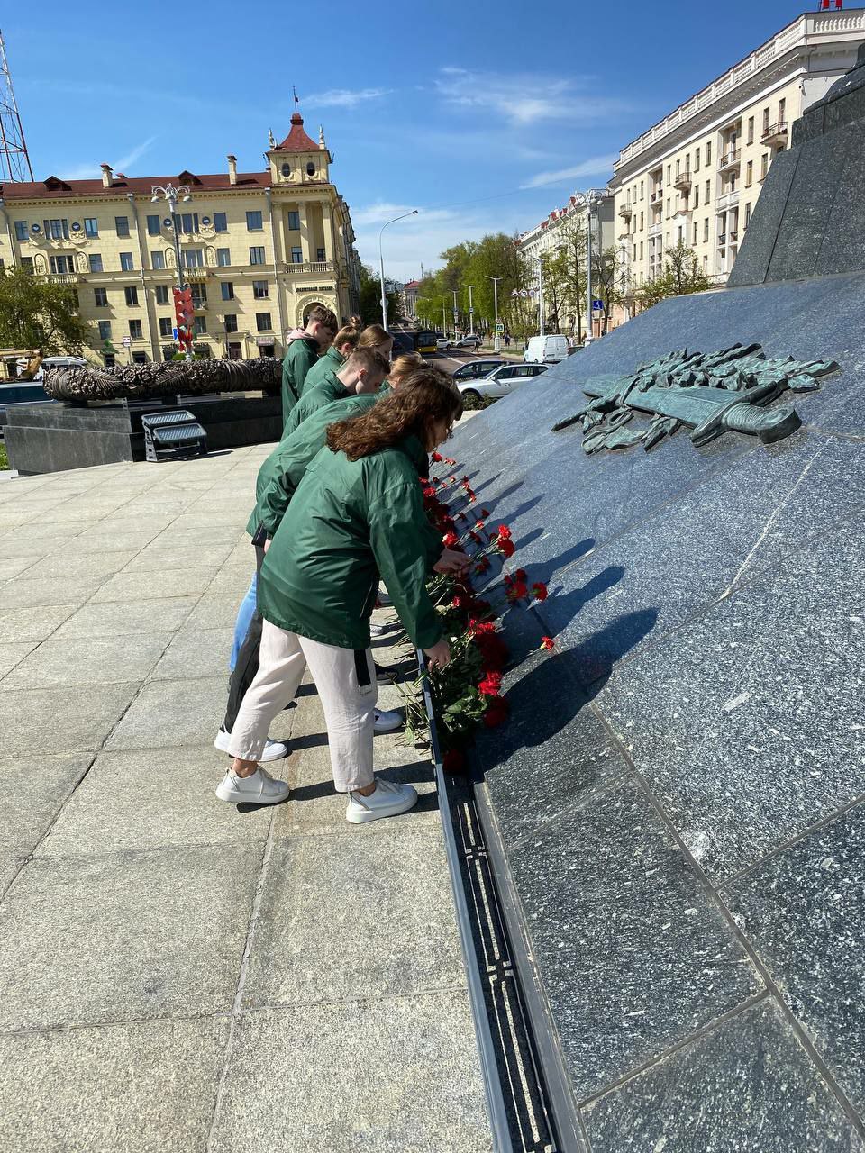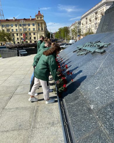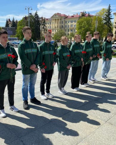 После студенты отправились на площадь Победы, где возложили цветы к монументу Победы – монументу-обелиску в честь победы в Великой Отечественной войне и в память о воинах Красной Армии, партизанах и подпольщиках, погибших в годы Великой Отечественной войны.