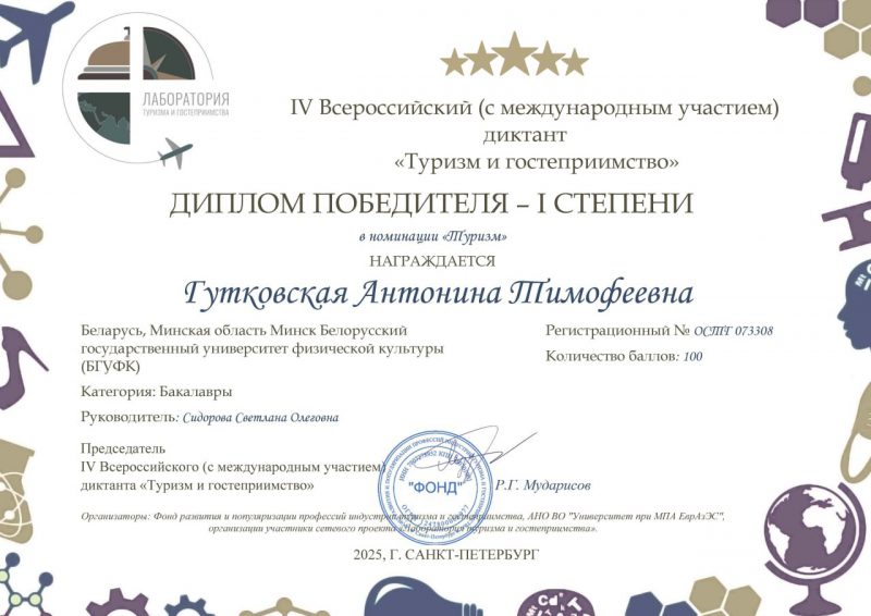 - Гутковская Антонина (группа 4401) — показала уникальный результат, набрав 100 баллов из 100 сразу в двух категориях: «Гостеприимство» и «Туризм».