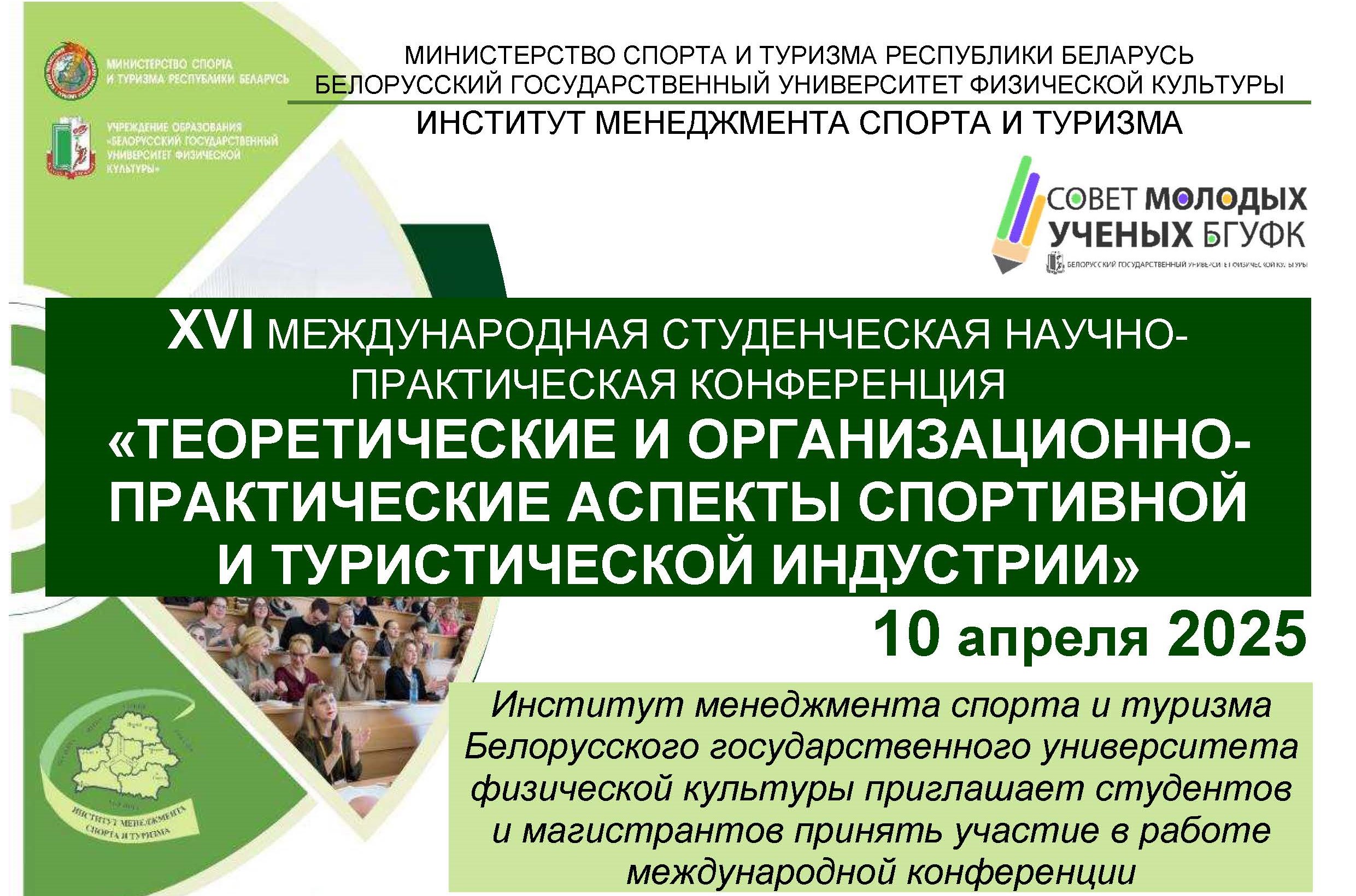 Институт менеджмента спорта и туризма Белорусского государственного университета физической культуры 10 апреля 2025 года собрал гостей и молодых исследователей в рамках XVI Международной студенческой научно-практической конференции «Теоретические и организационно-практические аспекты спортивной и туристической индустрии», которая состоялась в рамках Фестиваля университетской науки.