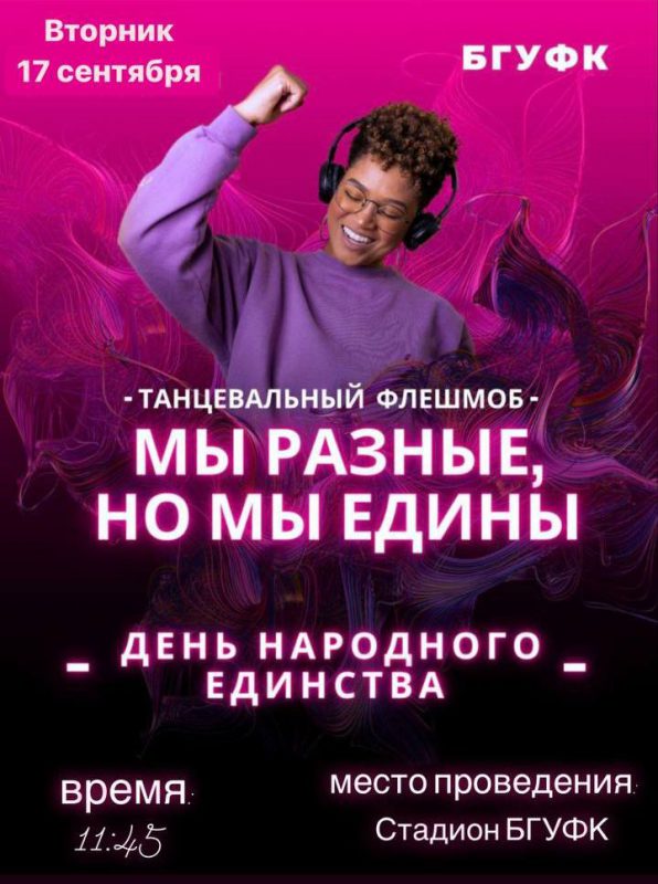 17 сентября в 11.45 на стадионе БГУФК состоится танцевальный флешмоб «Мы разные, но мы едины», посвященный Дню народного единства.