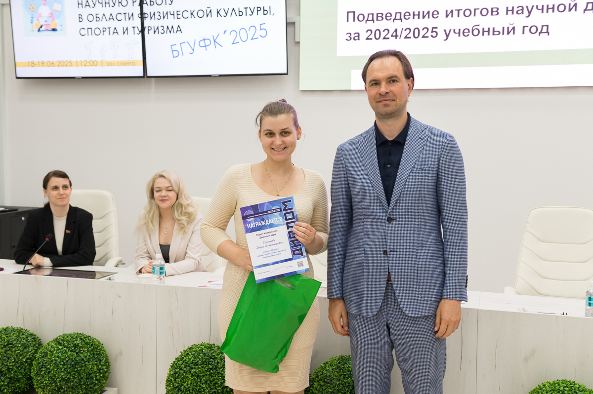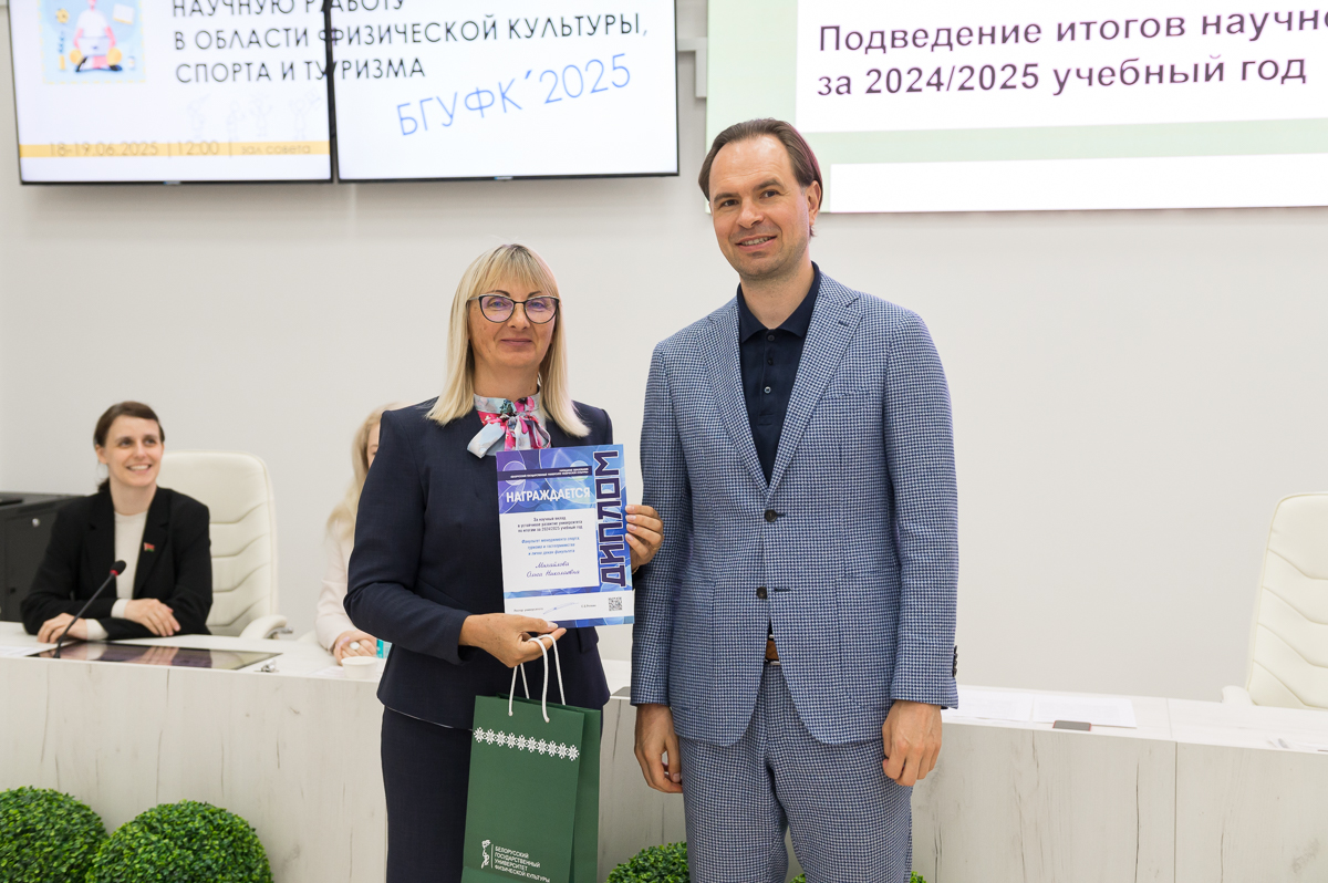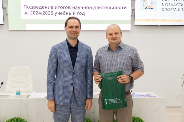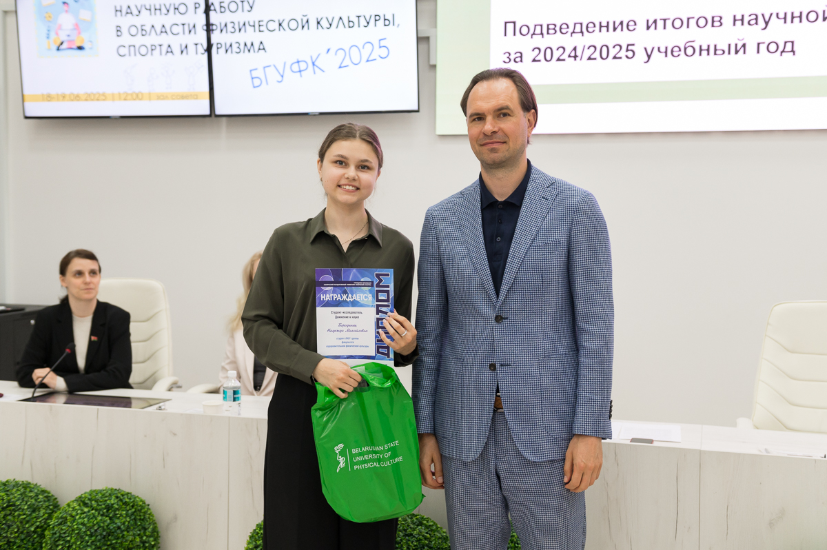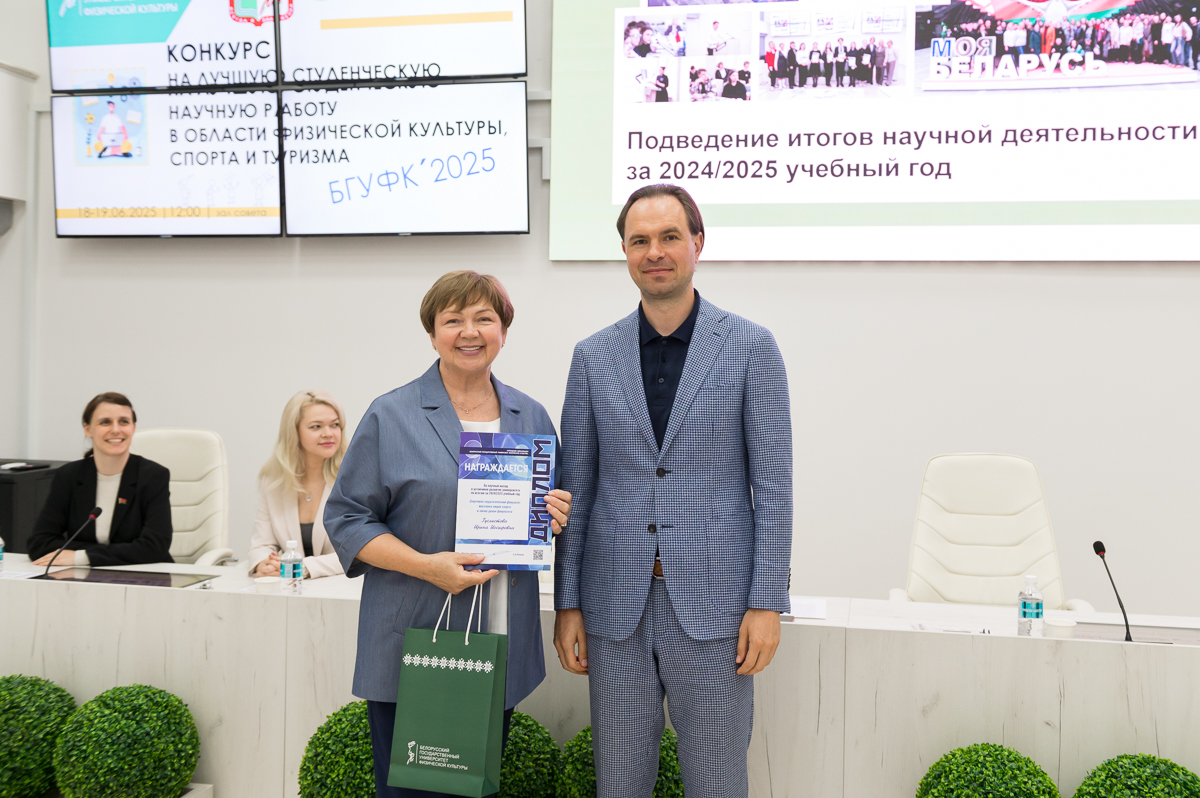 19 июня 2025 года в Белорусском государственном университете физической культуры перед финалом конкурса на лучшую студенческую научную работу в области физической культуры, спорта и туризма состоялось подведение итогов научной деятельности за текущий учебный год. Ректор университета Сергей Борисович Репкин в торжественной обстановке вручал дипломы и награды наиболее отличившимся преподавателям и студентам, отметив их значительный вклад в развитие университетской науки.