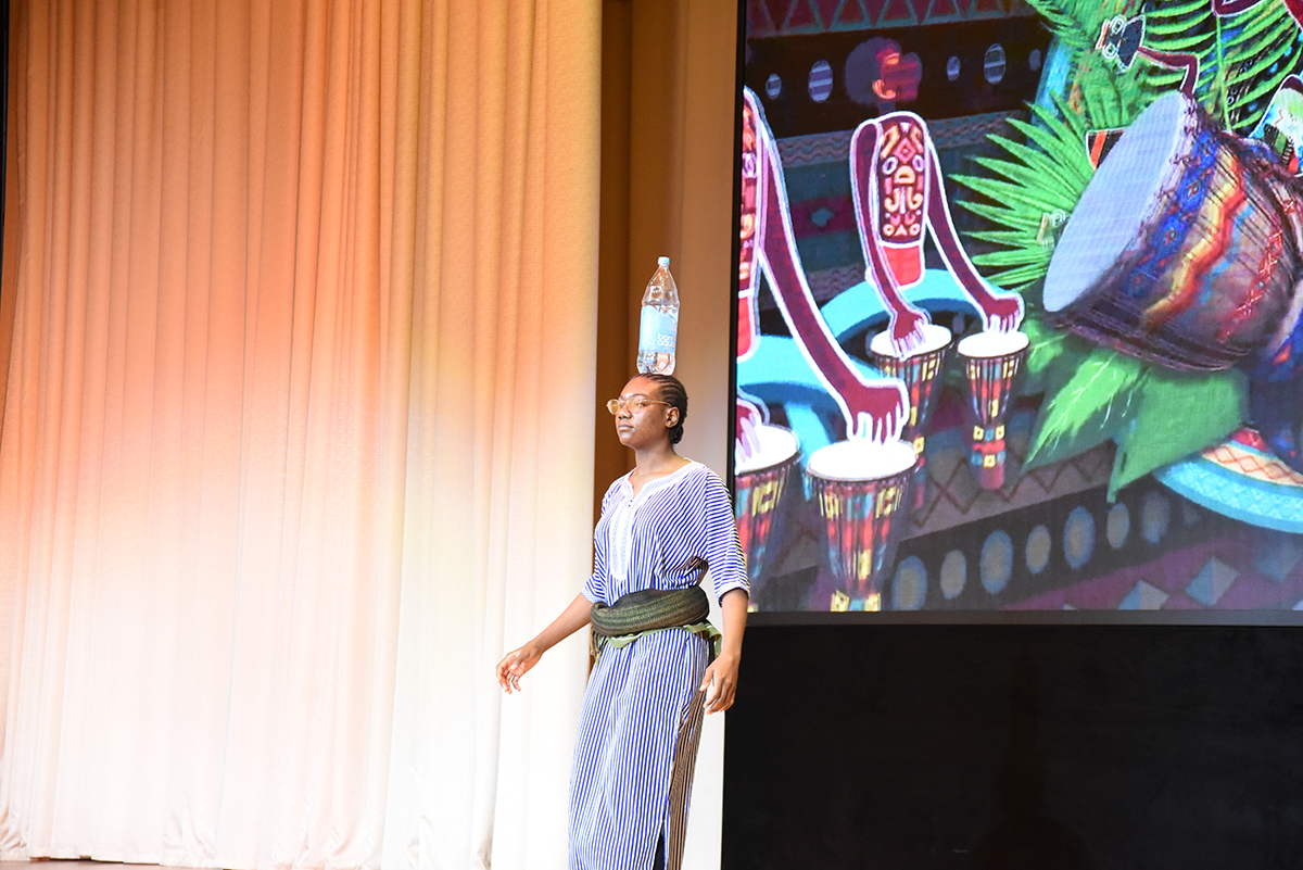 - Нгети Камалу Милен (Республика Камерун не только блистательно продекламировала стихотворение Э. Асадова «Счастье», но и покорила публику грациозным исполнением национального танца. Она грациозно и виртуозно балансировала под музыку, удерживая на голове тяжелый груз;