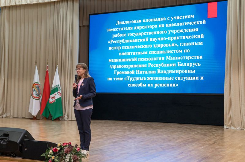 16 сентября состоялась диалоговая площадка «Трудные жизненные ситуации и способы их решения» с участием заместителя директора по идеологической работе государственного учреждения «Республиканский научно-практический центр психического здоровья», главным внештатным специалистом по медицинской психологии Министерства здравоохранения Республики Беларусь Громовой Наталии Владимировны.